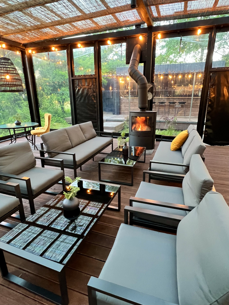 Собственная терраса с навесом, удобными креслами и журнальным столиком.
