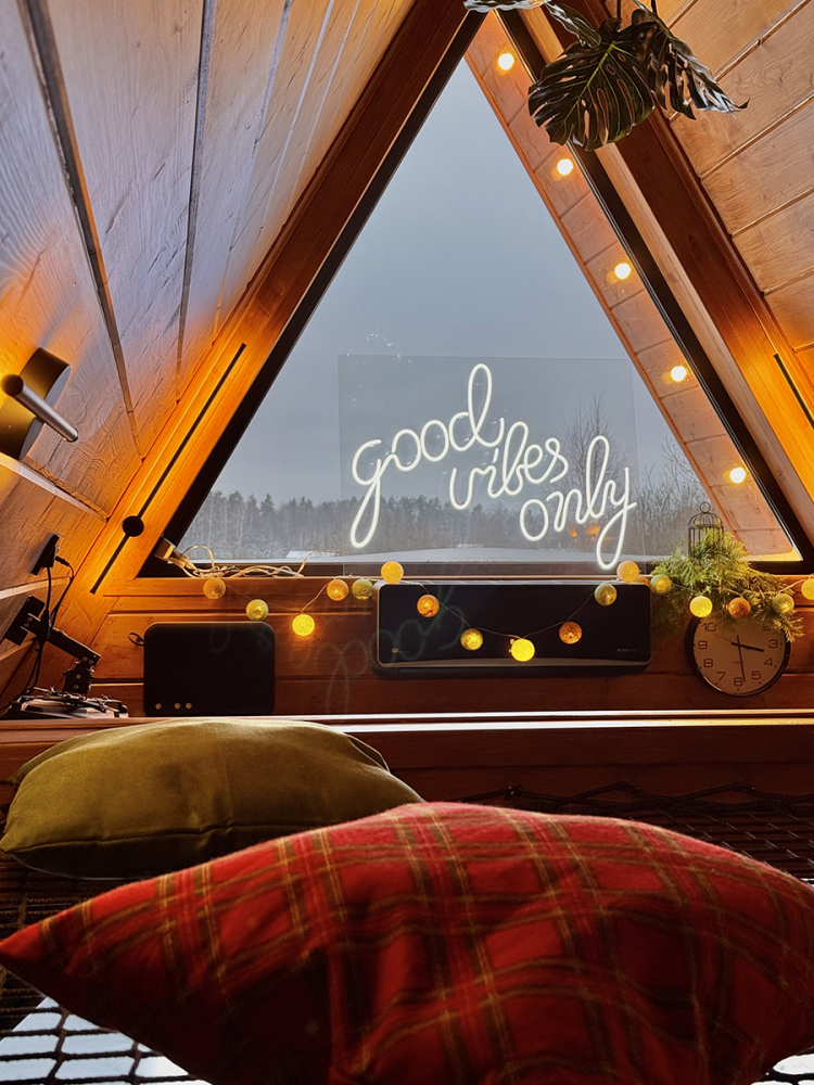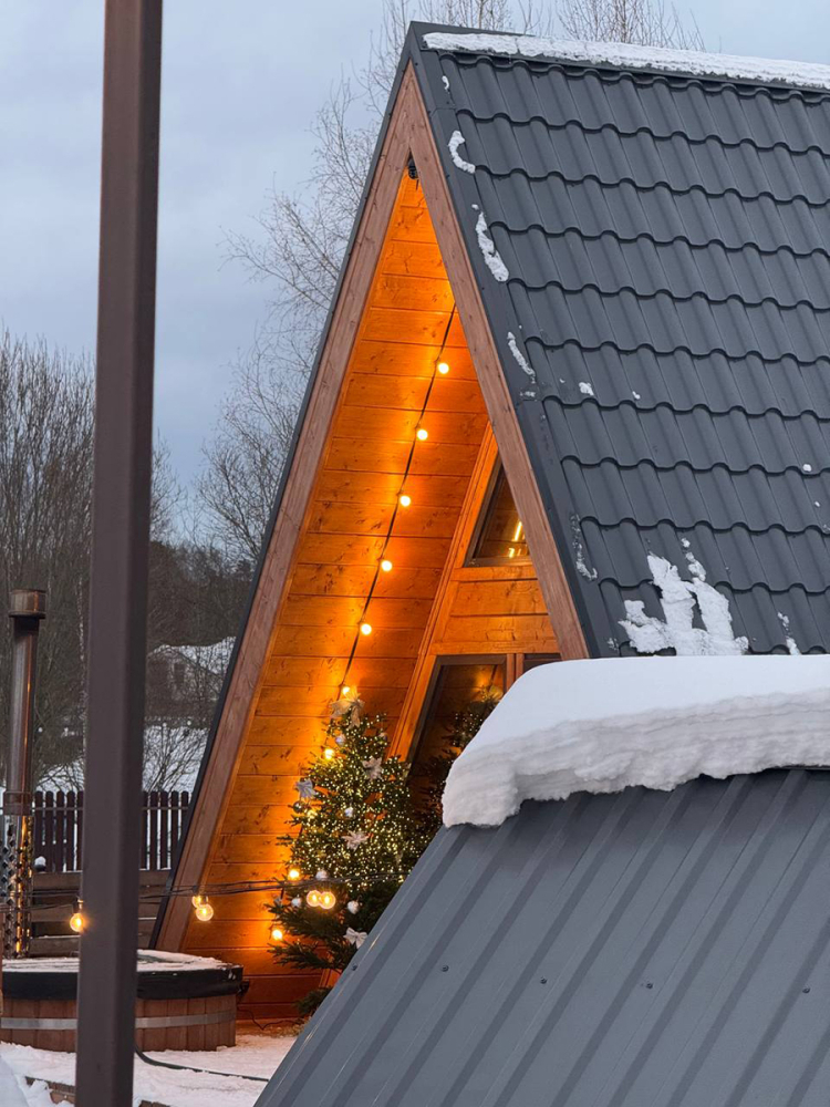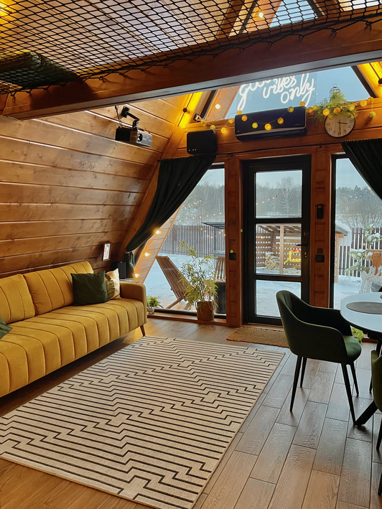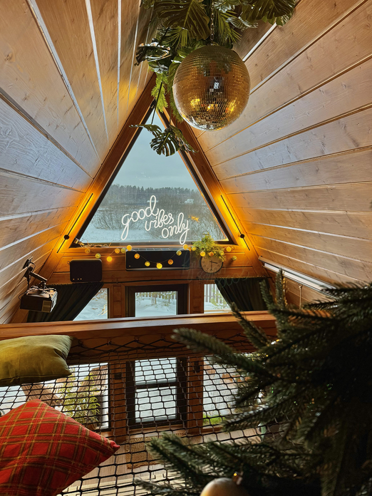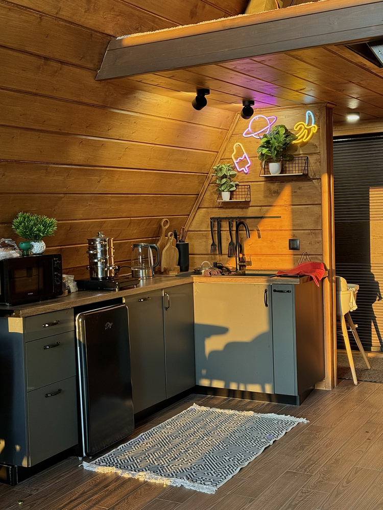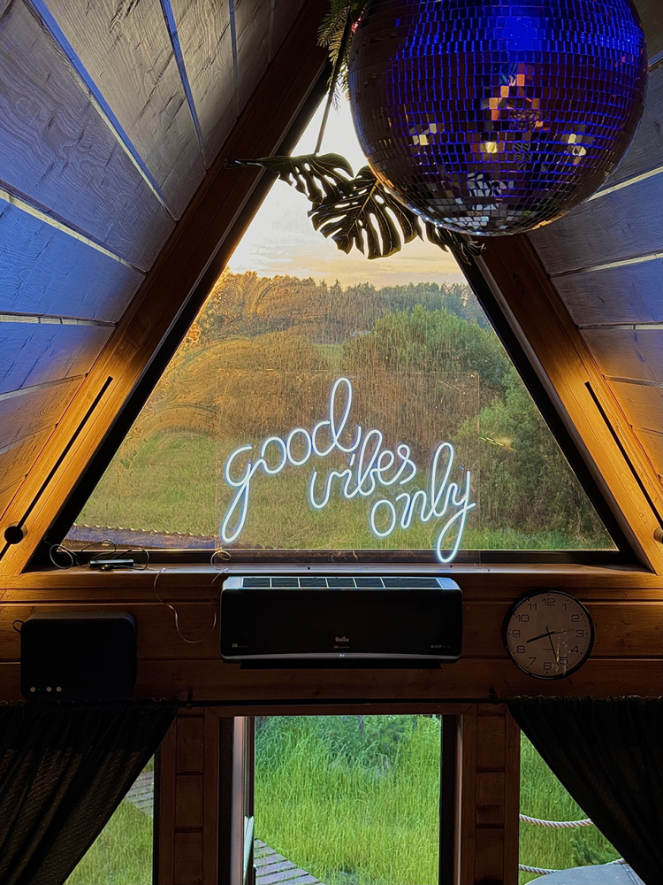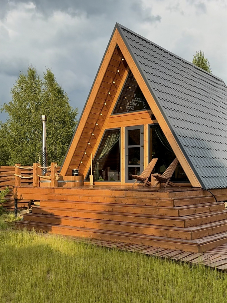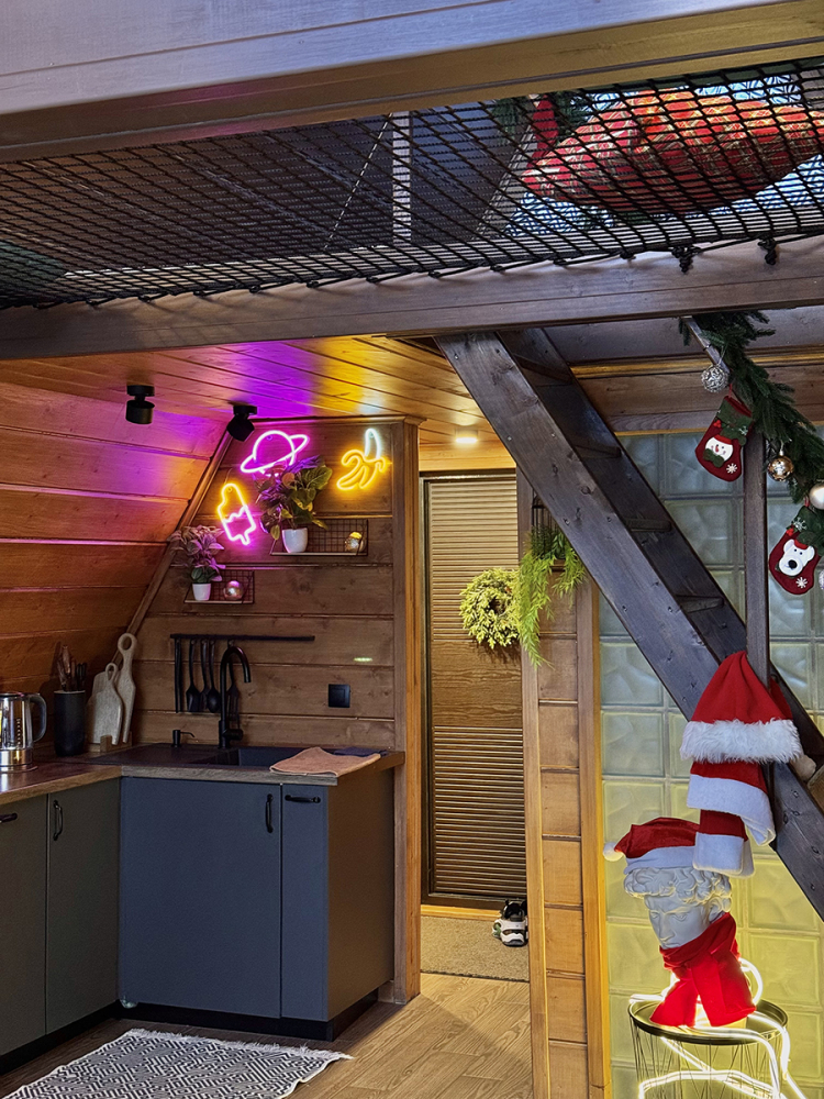 Абсолютно новый A-фрейм дом в стиле неоновых джунглей, выполненный в тёмных тонах с уникальными элементами декора: диско-шаром, цветными софитами, неоновыми вывесками и тропической зеленью. На просторной террасе расположена деревянная купель из сибирской лиственницы, а территория дома включает беседку, костровую и мангальную зоны.