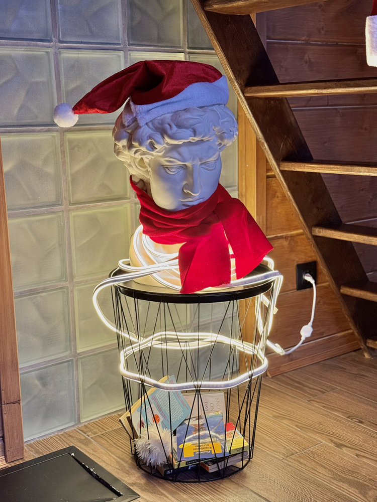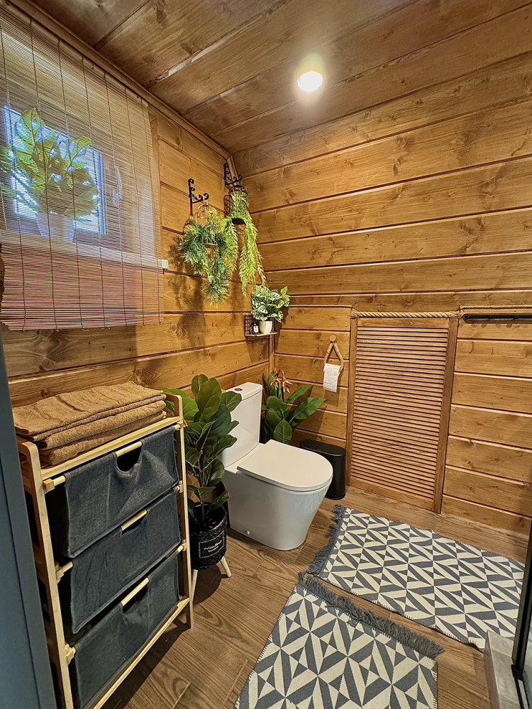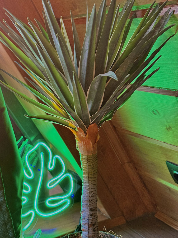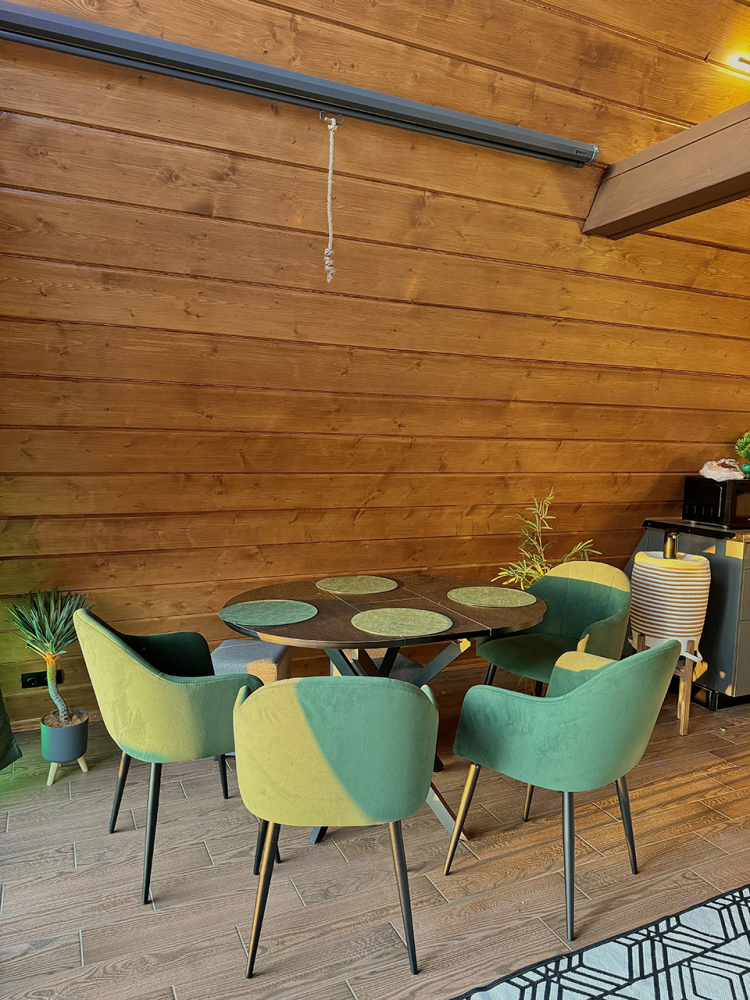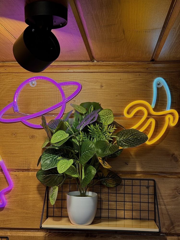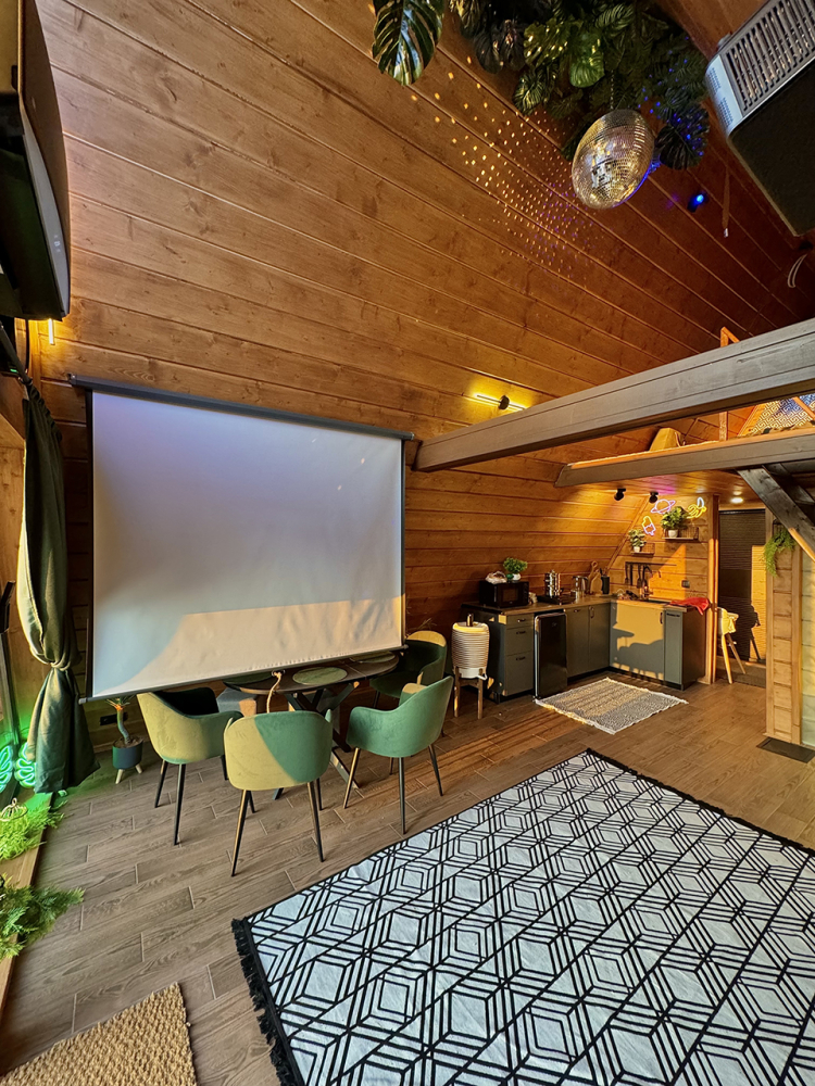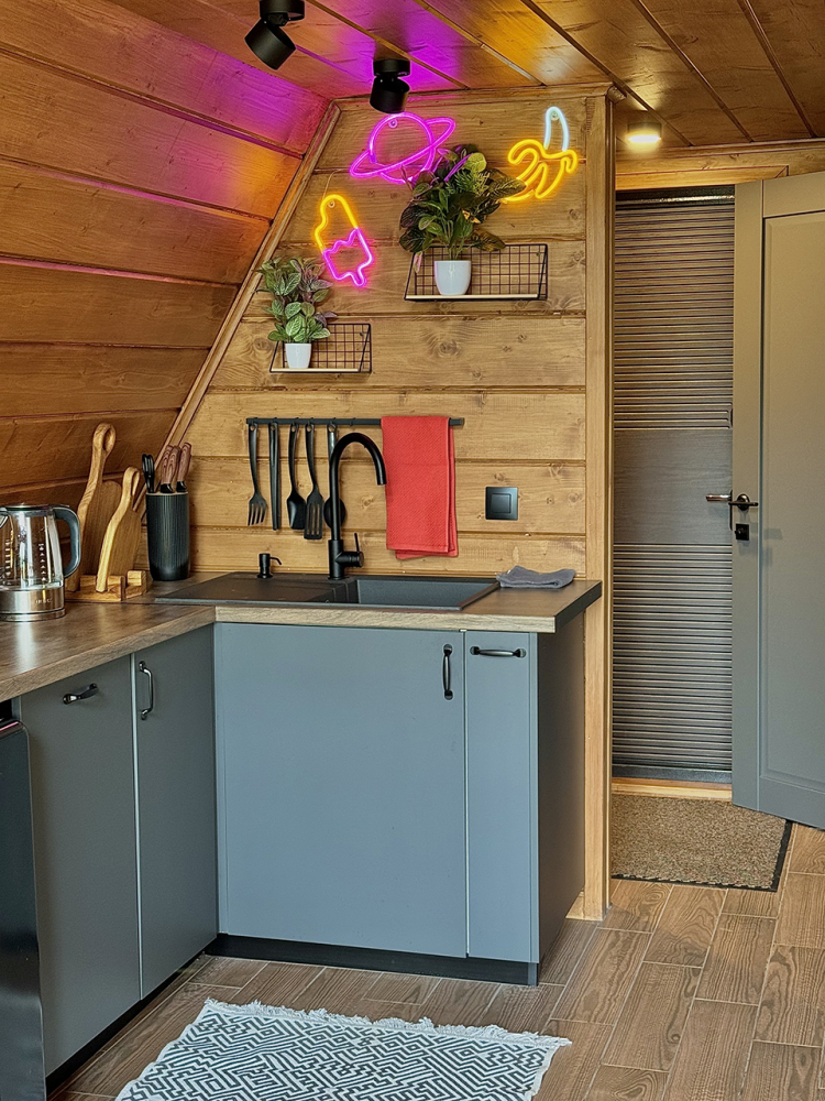 Дом в стиле неоновых джунглей - в темных тонах, с диско-шаром, цветными софитами, неоновыми вывесками-светильниками и тропической зеленью. В просторной террасе домика установлена деревянная купель из натуральной сибирской лиственницы. На территории домика располагается беседка, костровая и мангальная зоны.