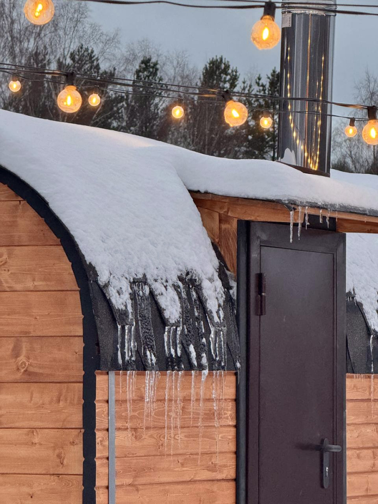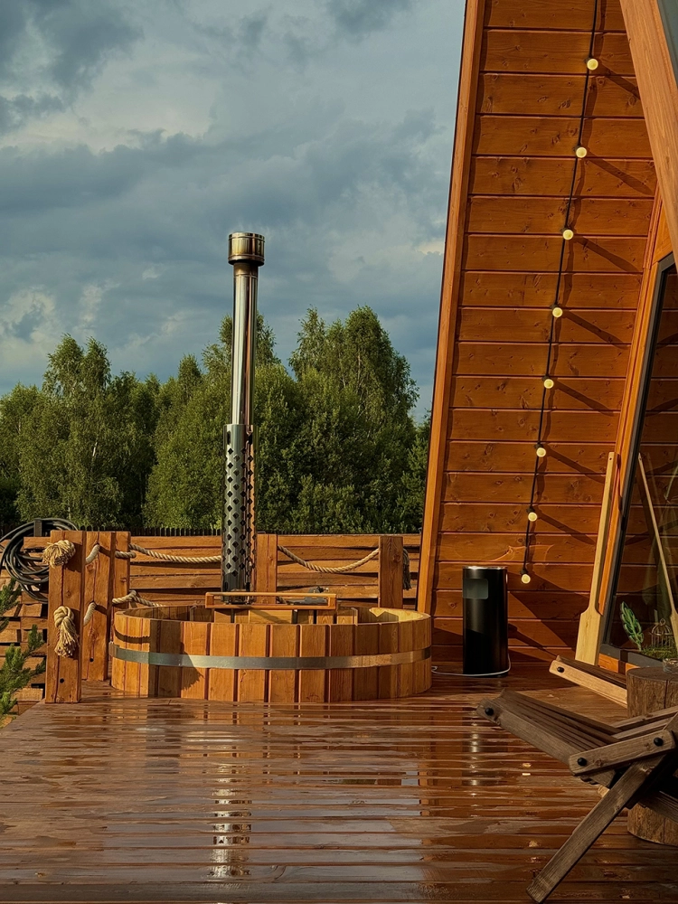 Купель из сибирской лиственницы прямо на террасе.