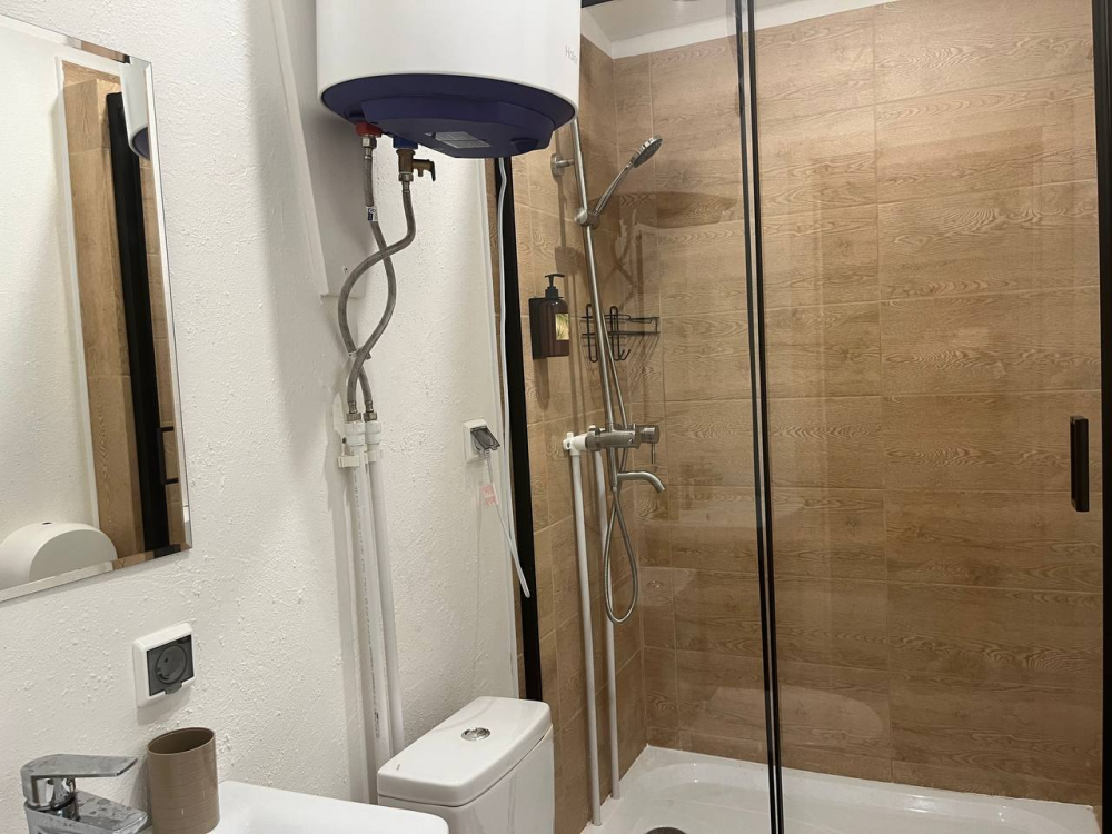 Оснащенная кухня: посуда, чайник, микроволновая печь, холодильник, электрическая плитка, соль и сахар.