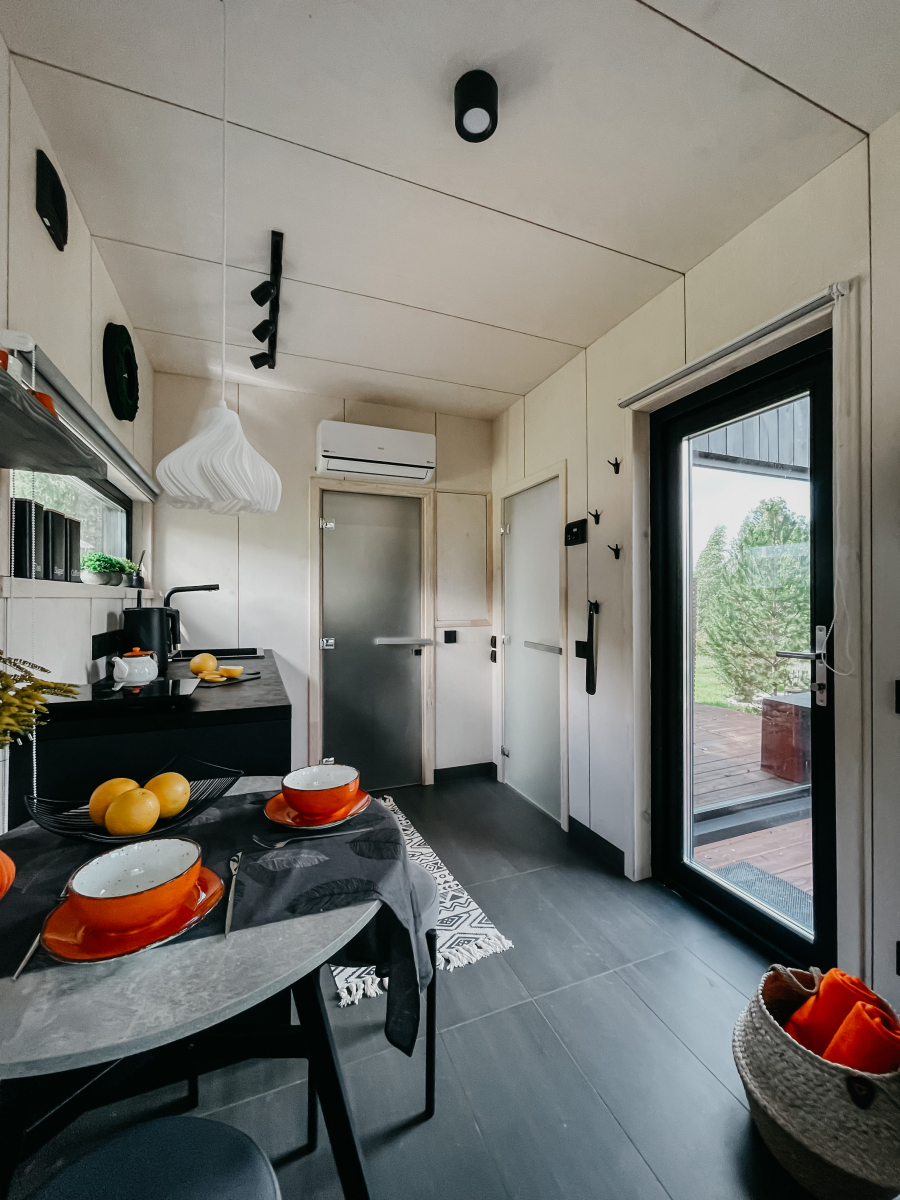 Атмосфера дома: Яркий гибрид, в котором прекрасно сочетаются сауна и горячая купель на улице (собственно, она и послужила идеей названия дома). Здесь вы соберете комбо неспешного отдыха на природе или, наблюдая за ней, через панорамные окна.