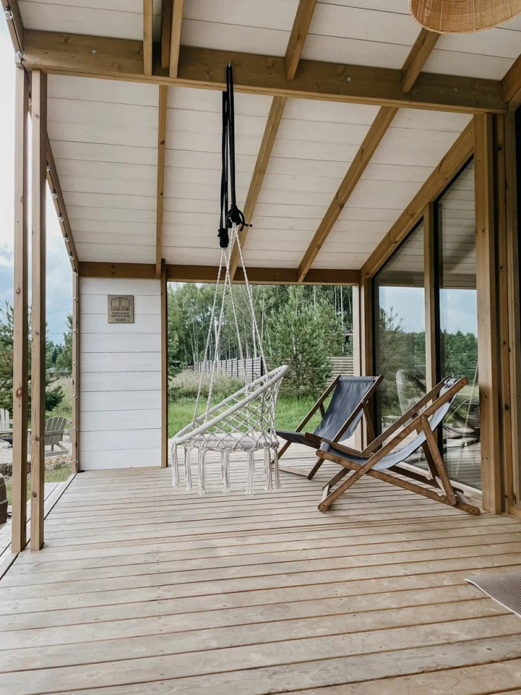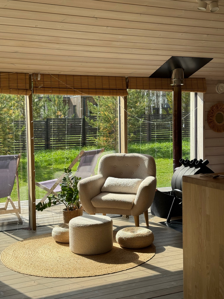На открытой веранде оборудована зона для отдыха с удобной уличной мебелью.