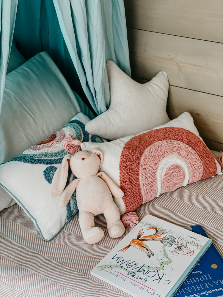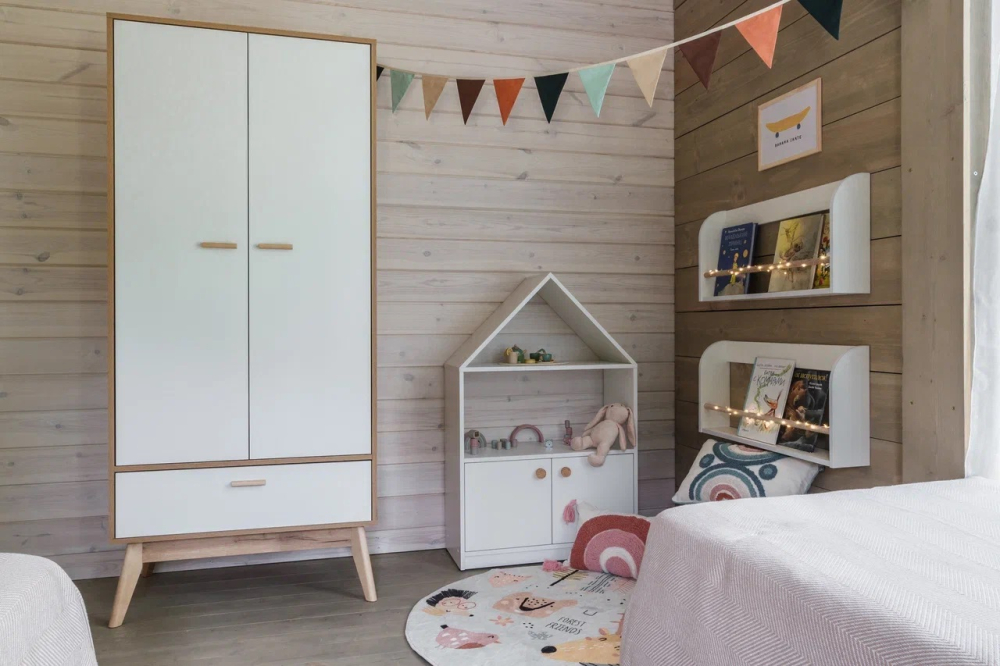 Отдельная комната отведена под детскую с двумя односпальными кроватями, игрушками и книгами.