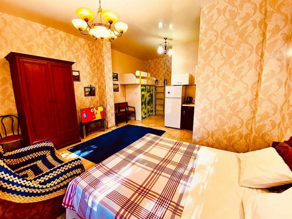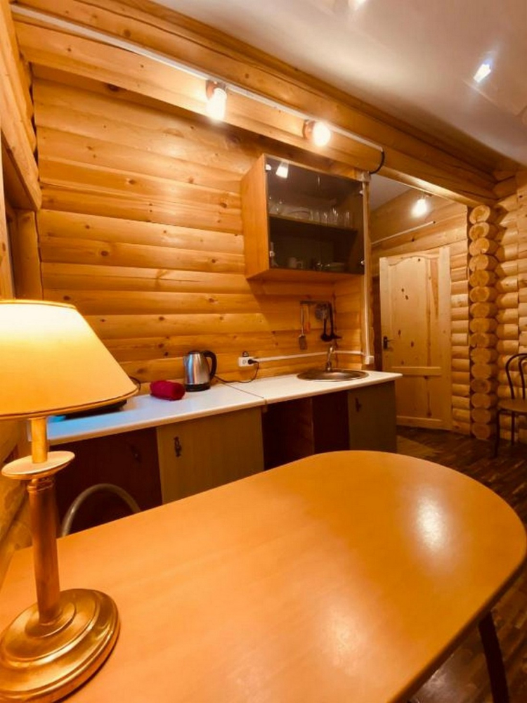 Оснащение включает мини-кухню с полным набором посуды, холодильником и электрочайником.