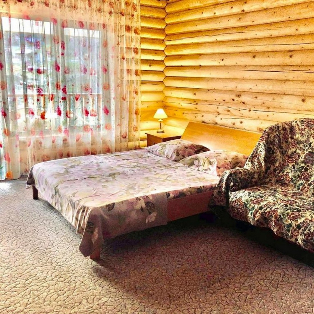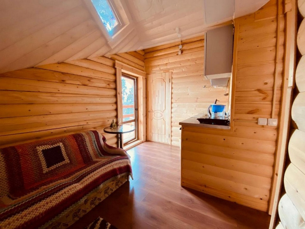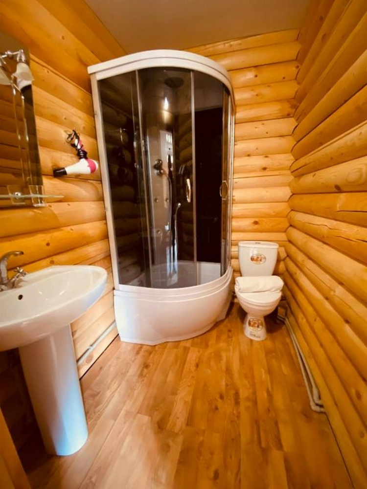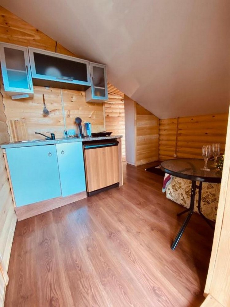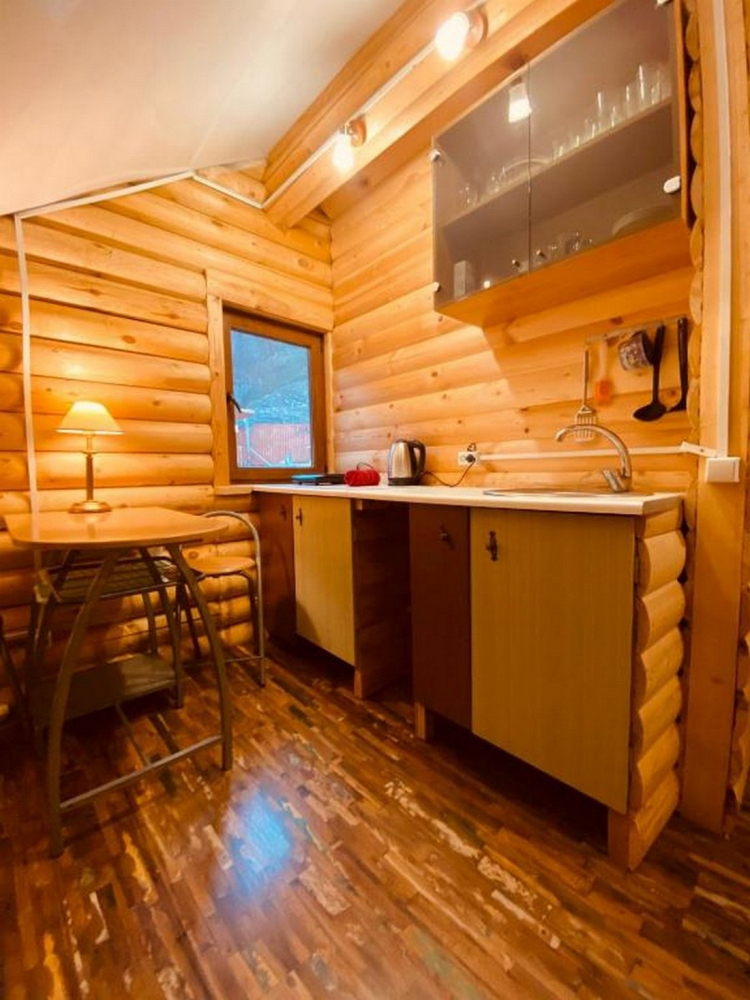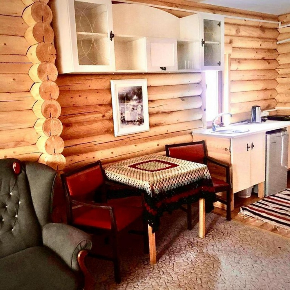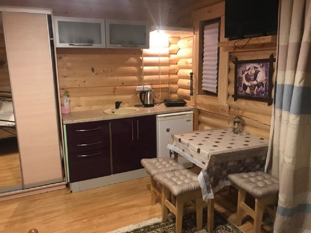 Номера представлены в виде однокомнатных и двухкомнатных срубов.