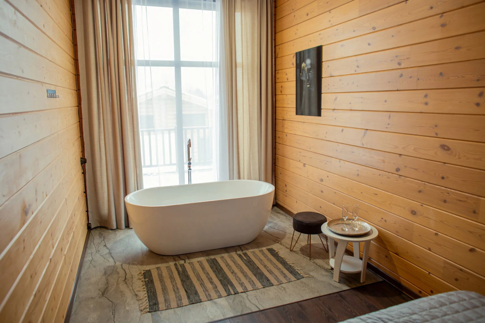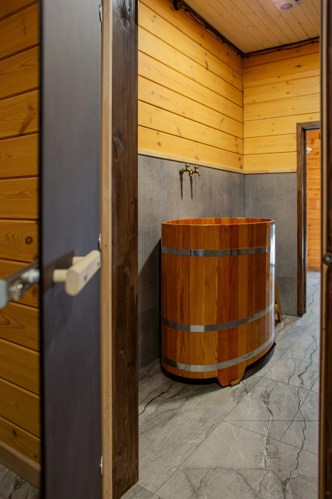 Чан "ТАЁЖНЫЙ", расположенный в индивидуальной премиальной бане, включает ароматную пихту, сосновые и кедровые шишки; стоимость использования — 10 000 ₽.