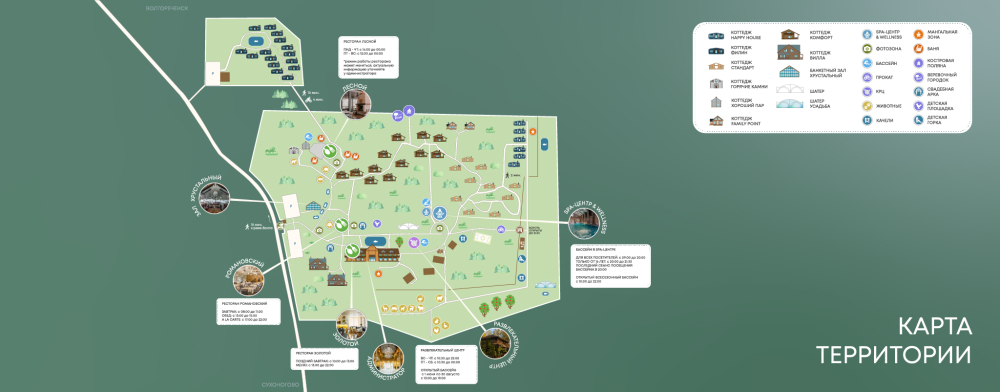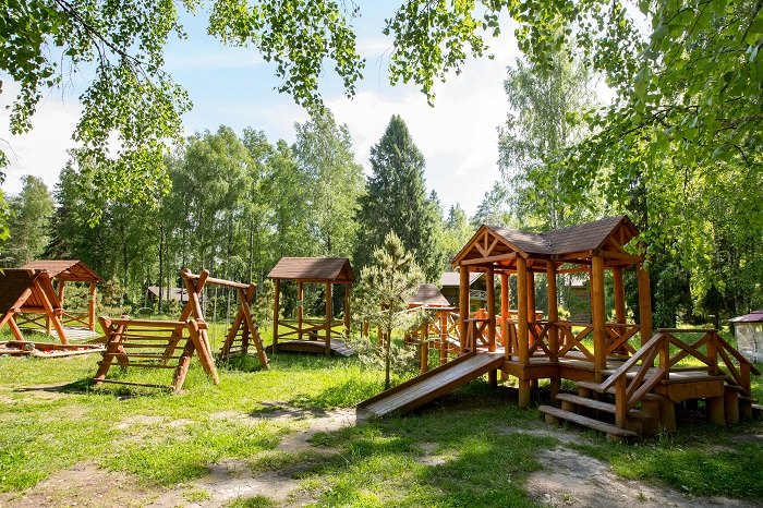 Развлекательные и спортивные зоны: веревочный городок, зоопарк, каток, квесты, прокат велосипедов, верховая езда, пешие прогулки, катание на собачьей упряжке, рыбалка и экскурсии.