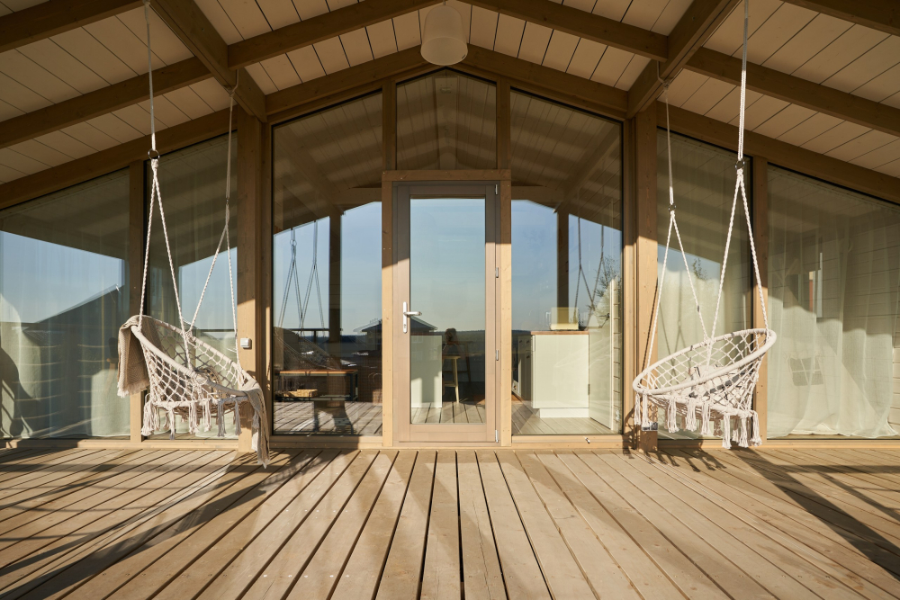 - Просторная веранда с качелями и видом на водохранилище.