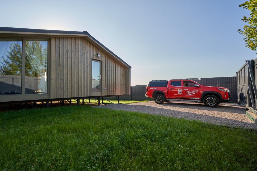 - Парковка на 2 автомобиля с ручными откатными воротами.