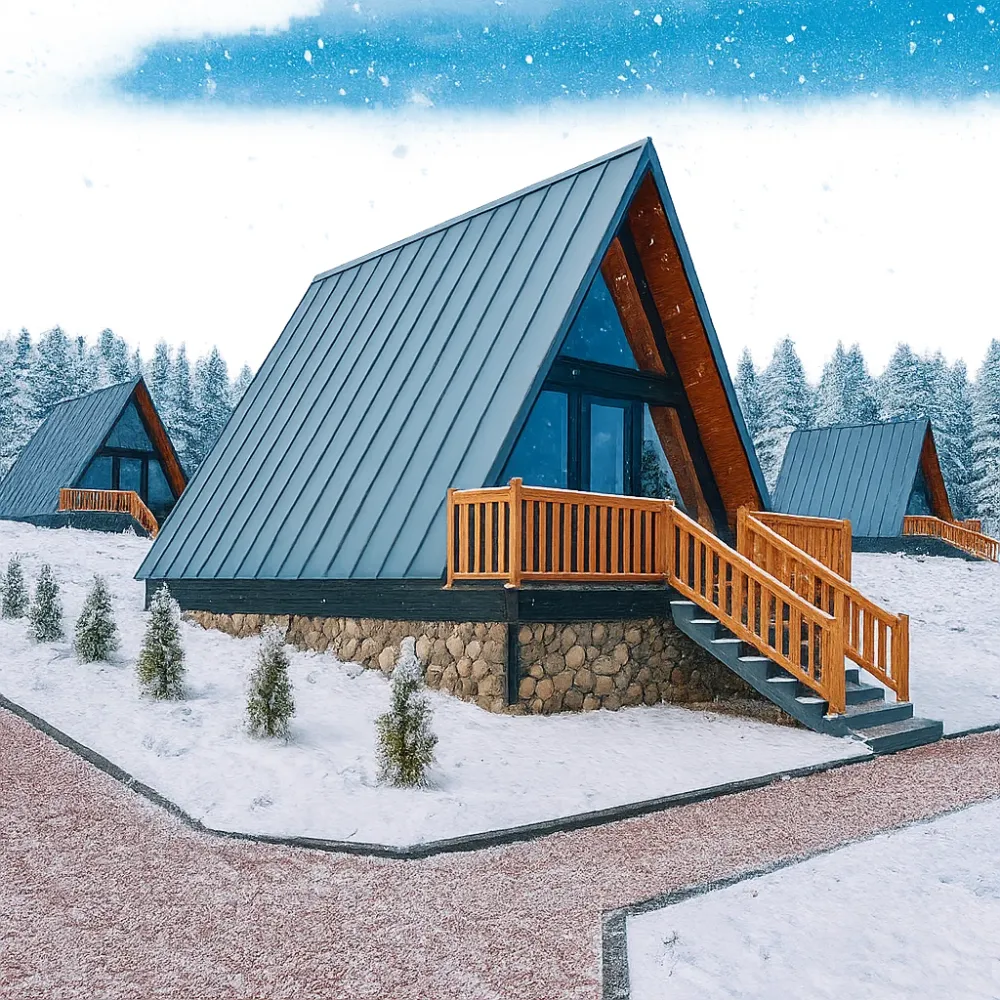- Домики А-образной формы с двуспальными матрасами для отдыха на двоих.
