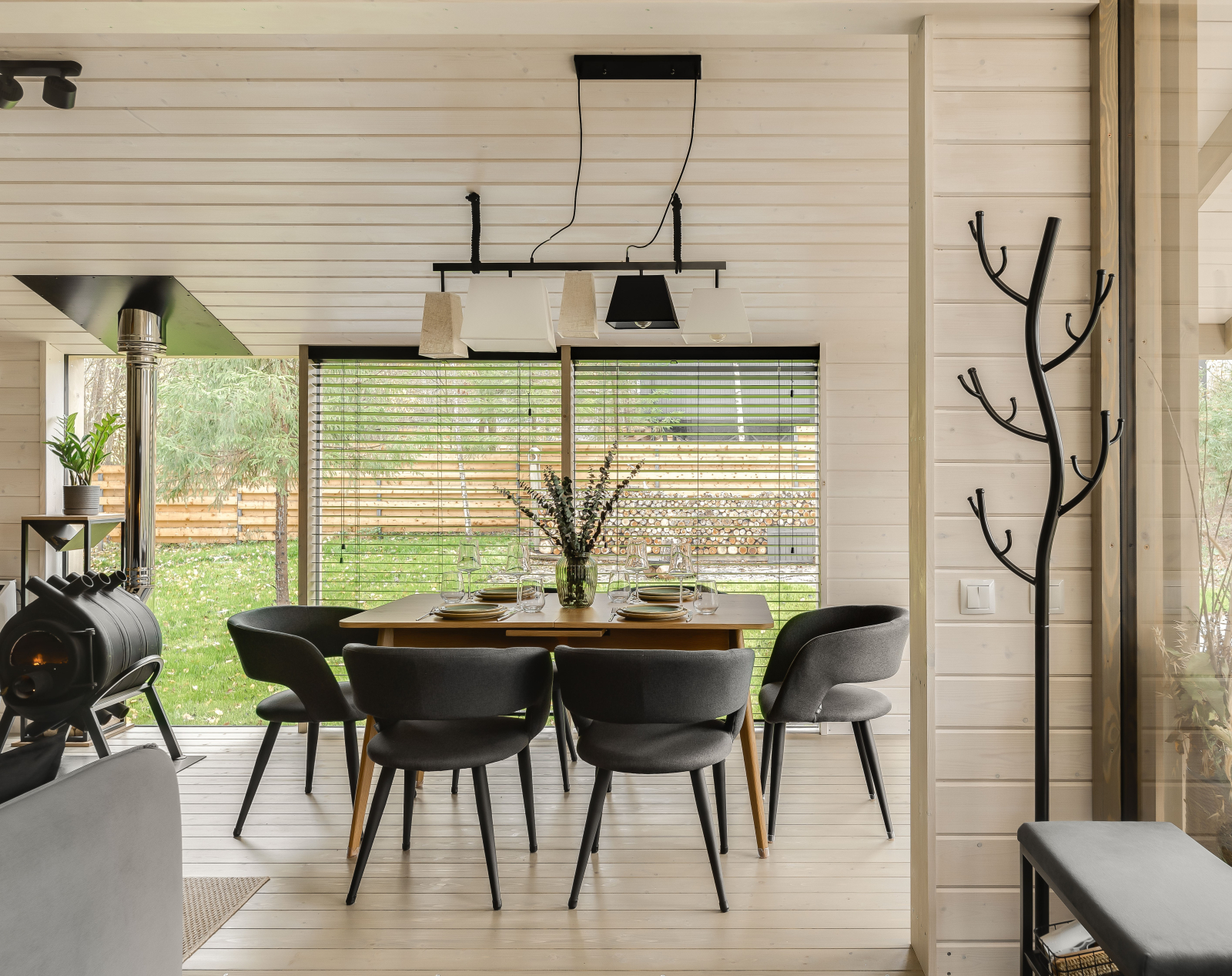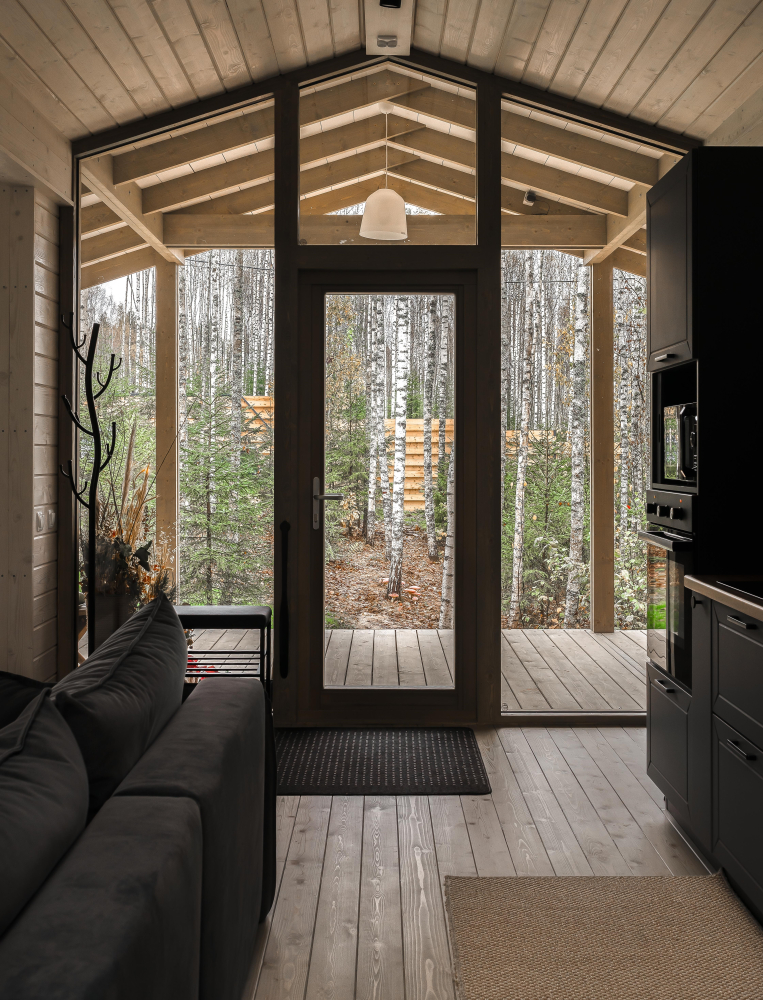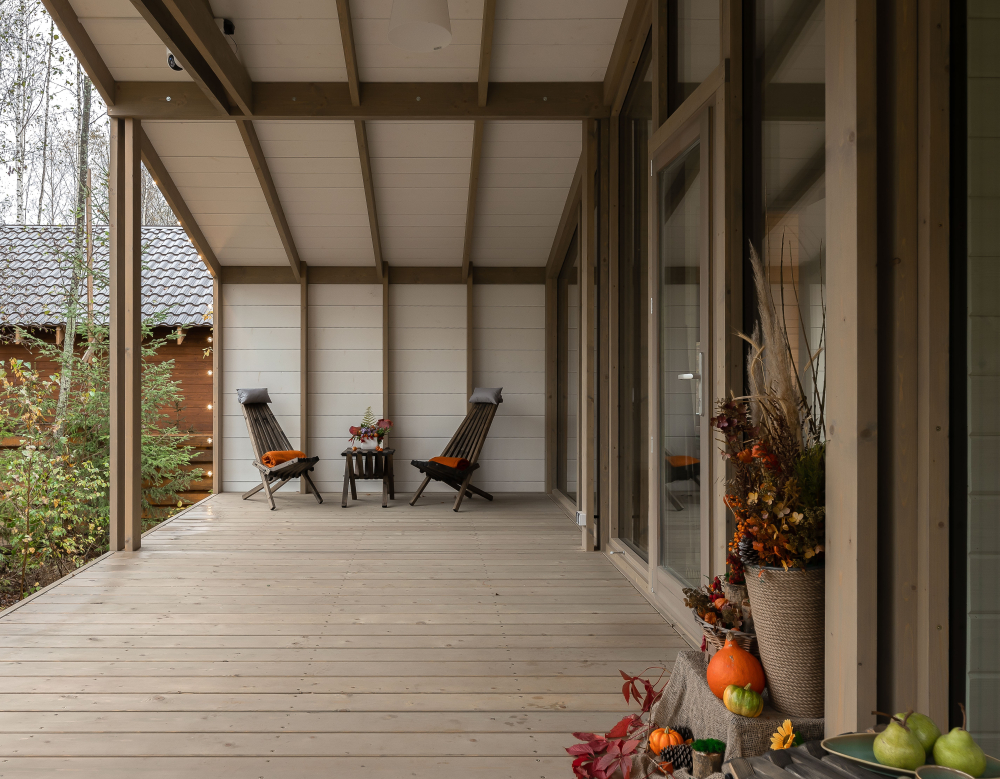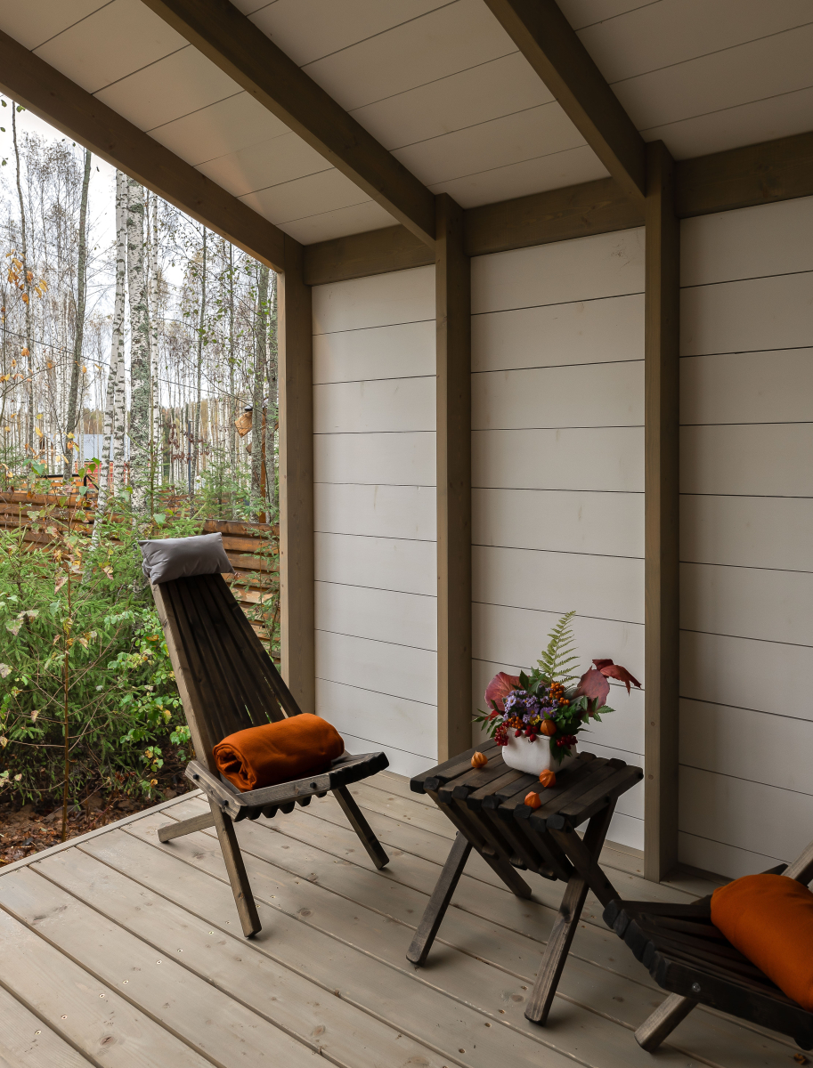 - Просторная веранда с качелями и видом на лес.