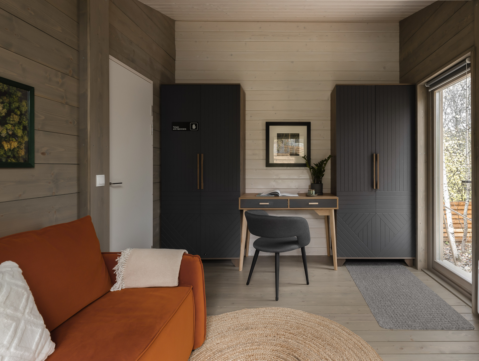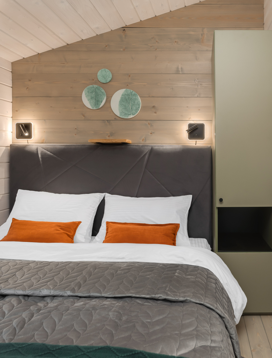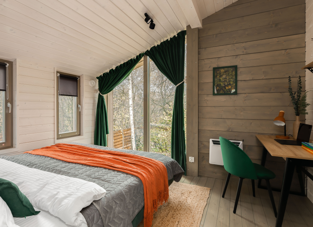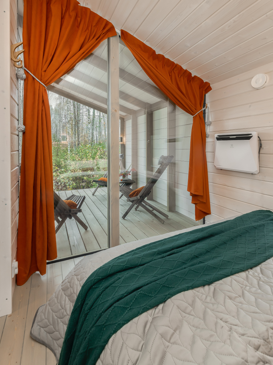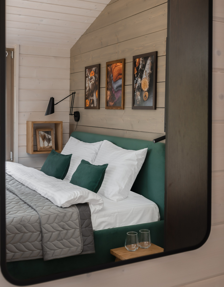 - Мастер-спальня: кровать 180х200, панорамное окно с видом на лес.