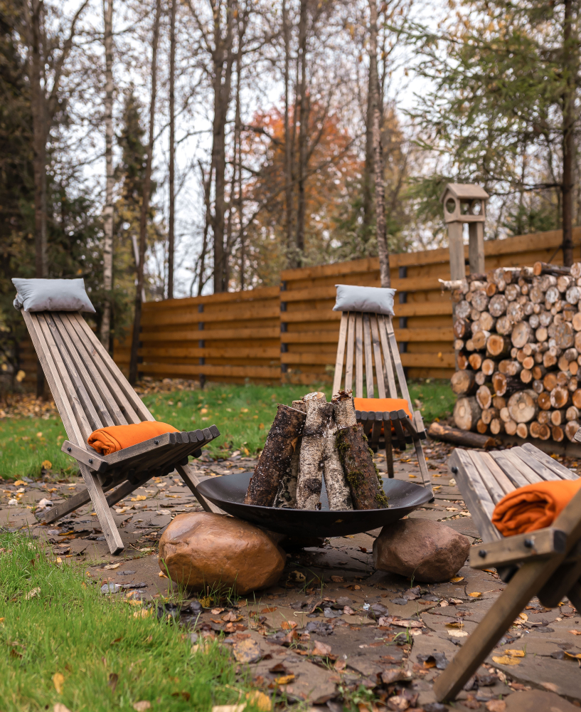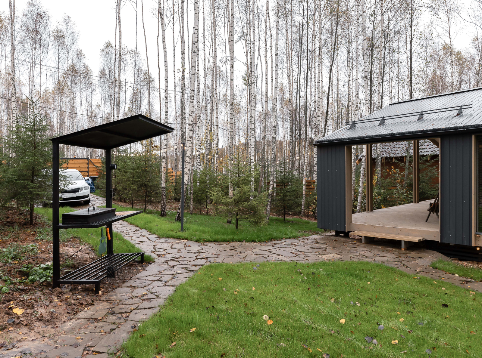 - Подготовленная территория с мангалом, костровой чашей и зоной отдыха.