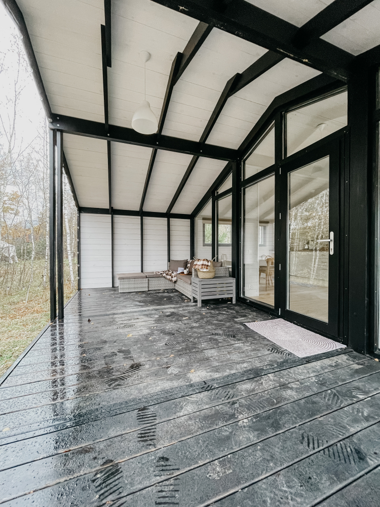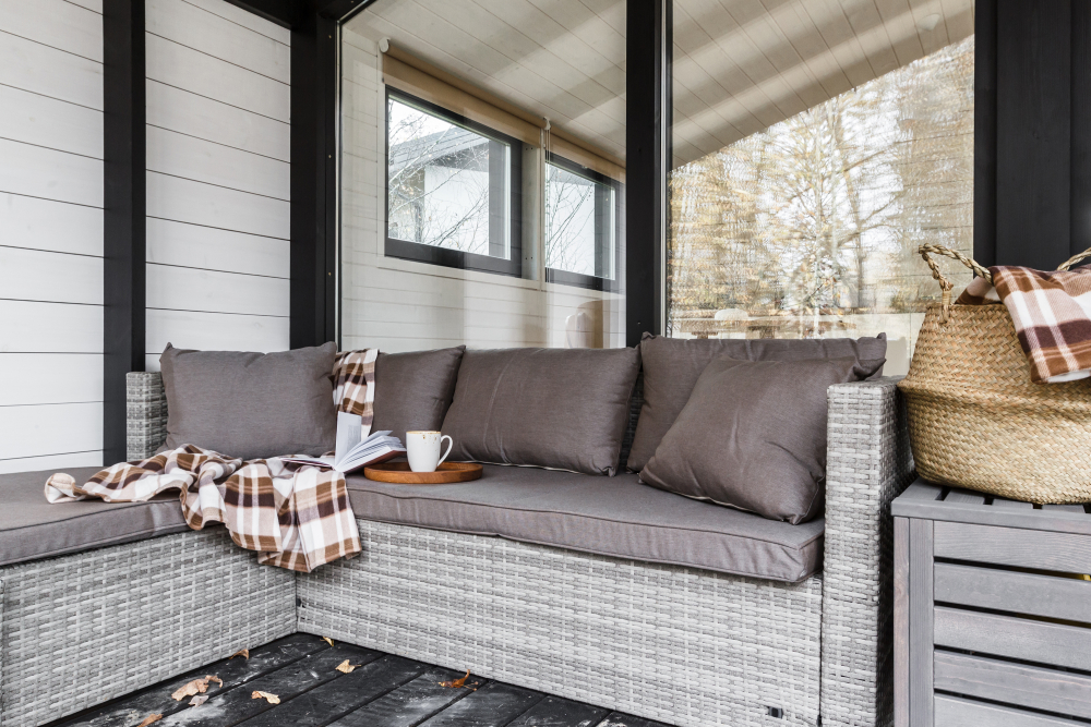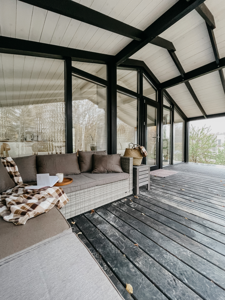 На большой открытой веранде комфортная уличная мебель для бесконечного чилла, созерцания и наслаждения.