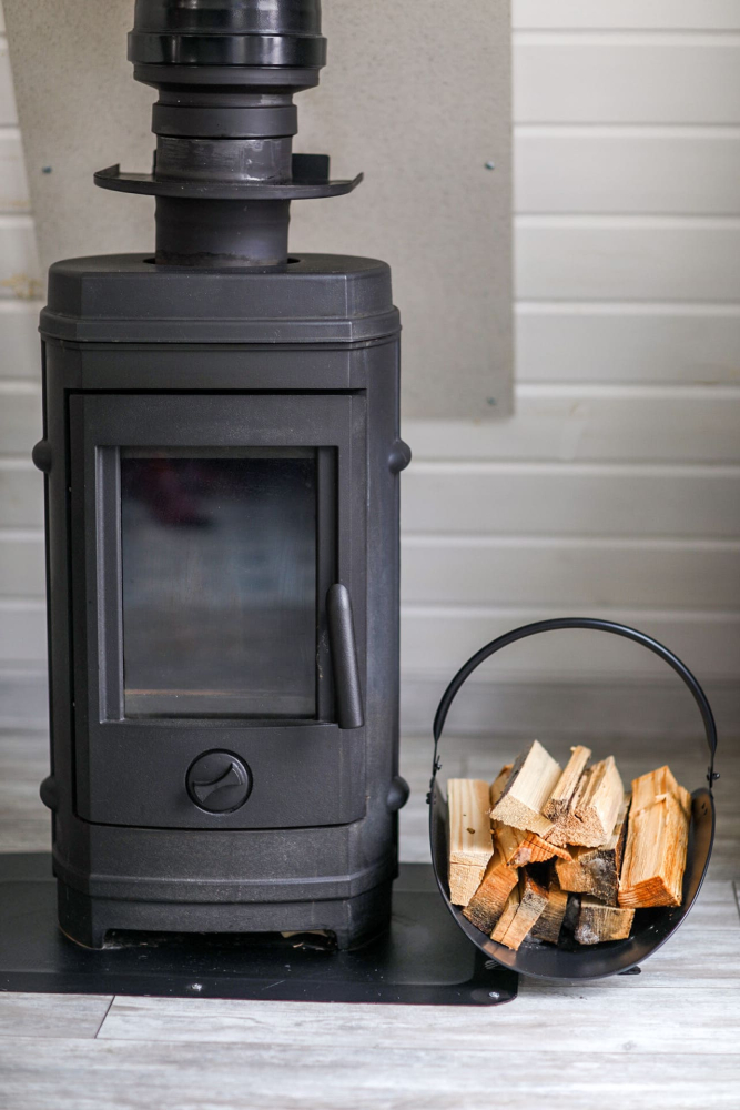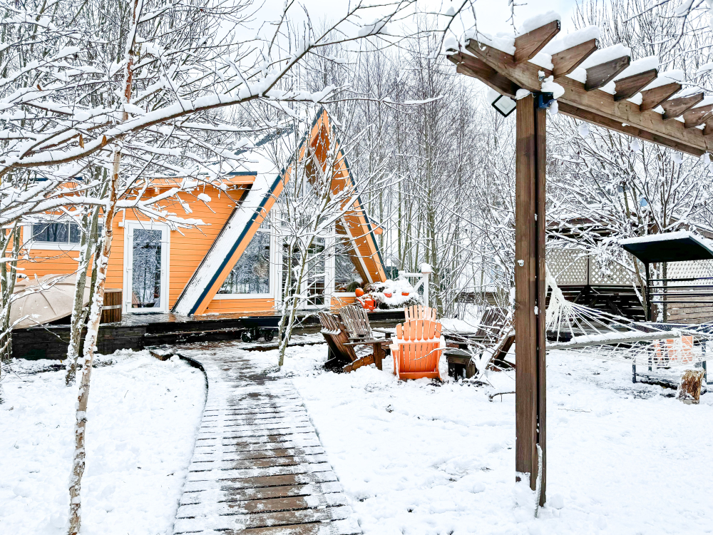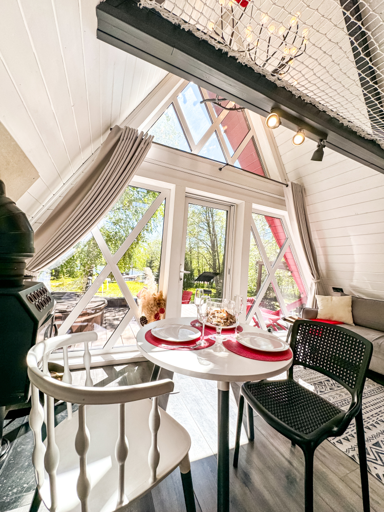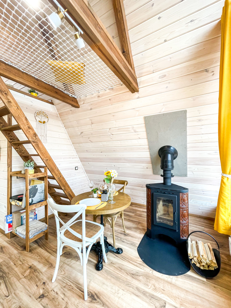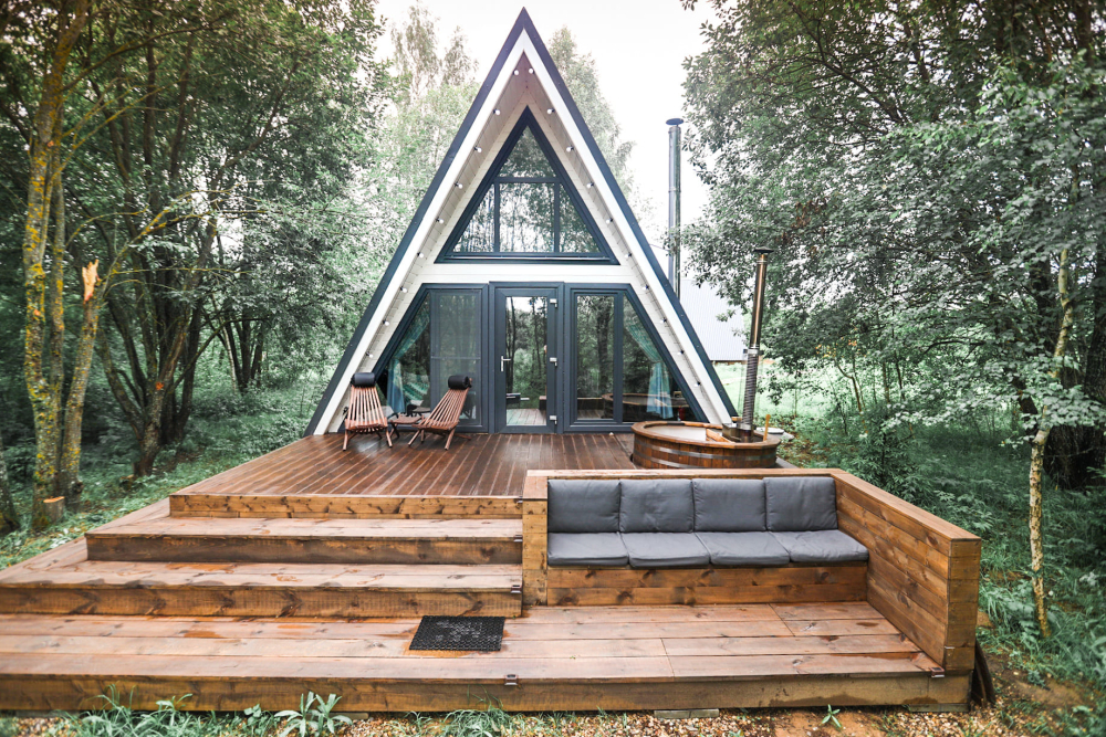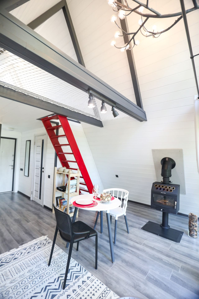 - Камин в А-фрейм домиках для уюта и тепла.