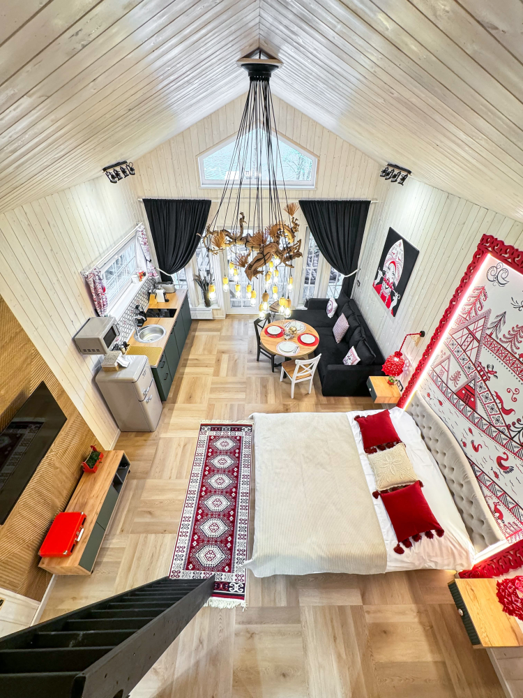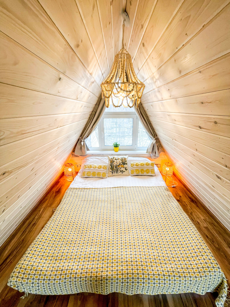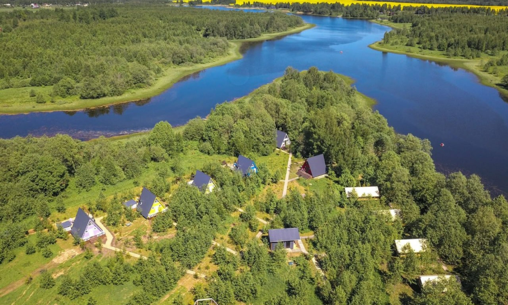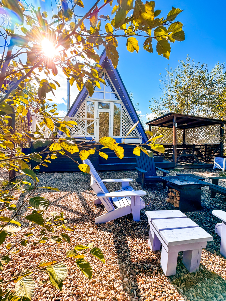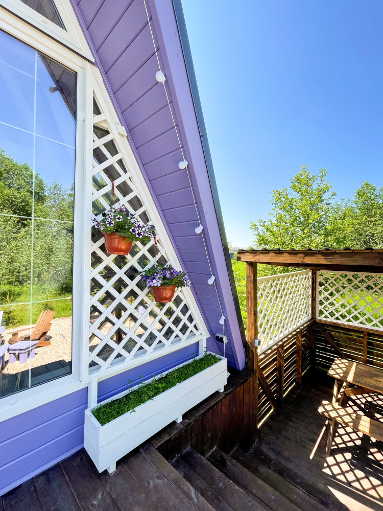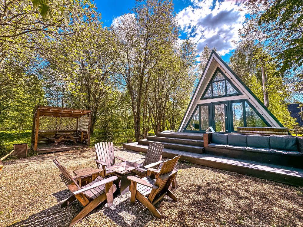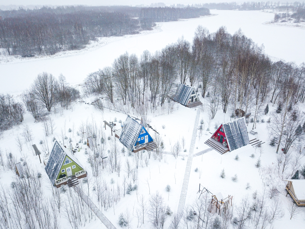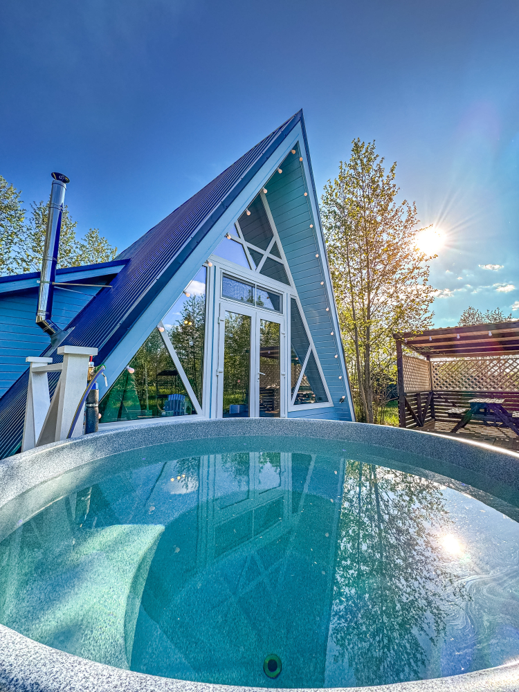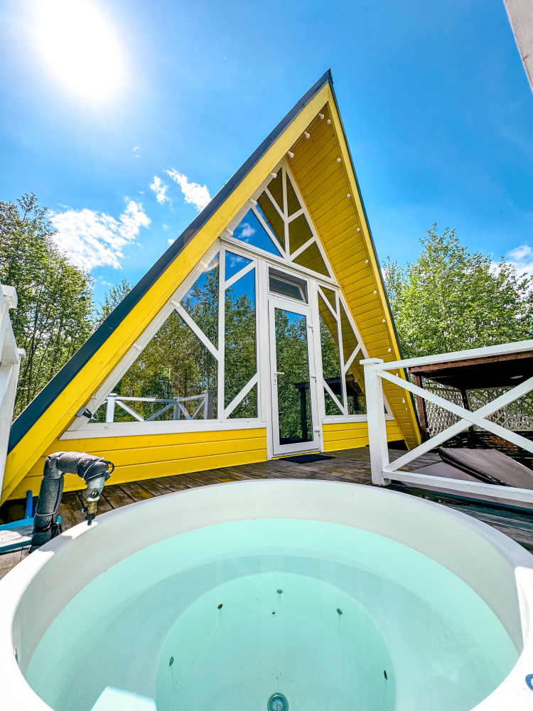 На нашей территории 13 уникальных цветных круглогодичных А-фрейм домов и этнодомов с горячими купелями на самом берегу реки. Каждый дом отличается цветовой гаммой не только снаружи, но и внутри.
