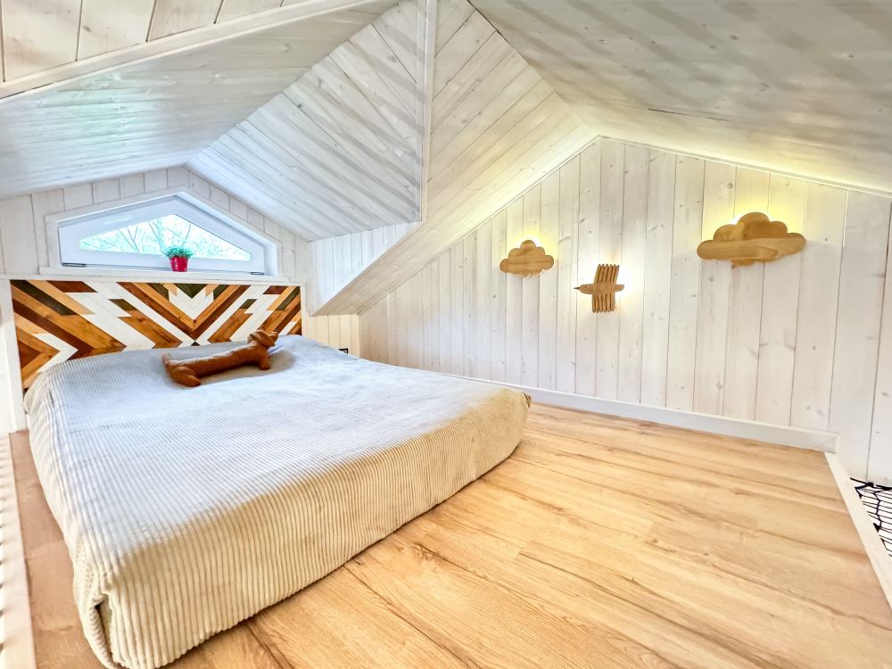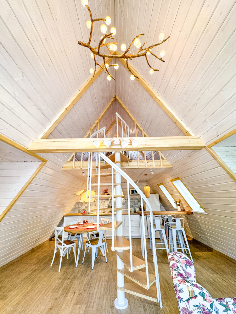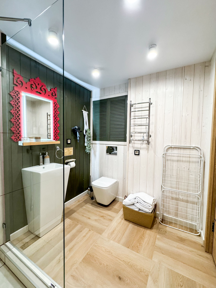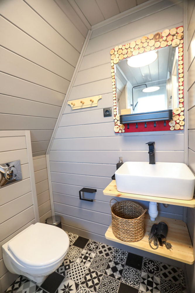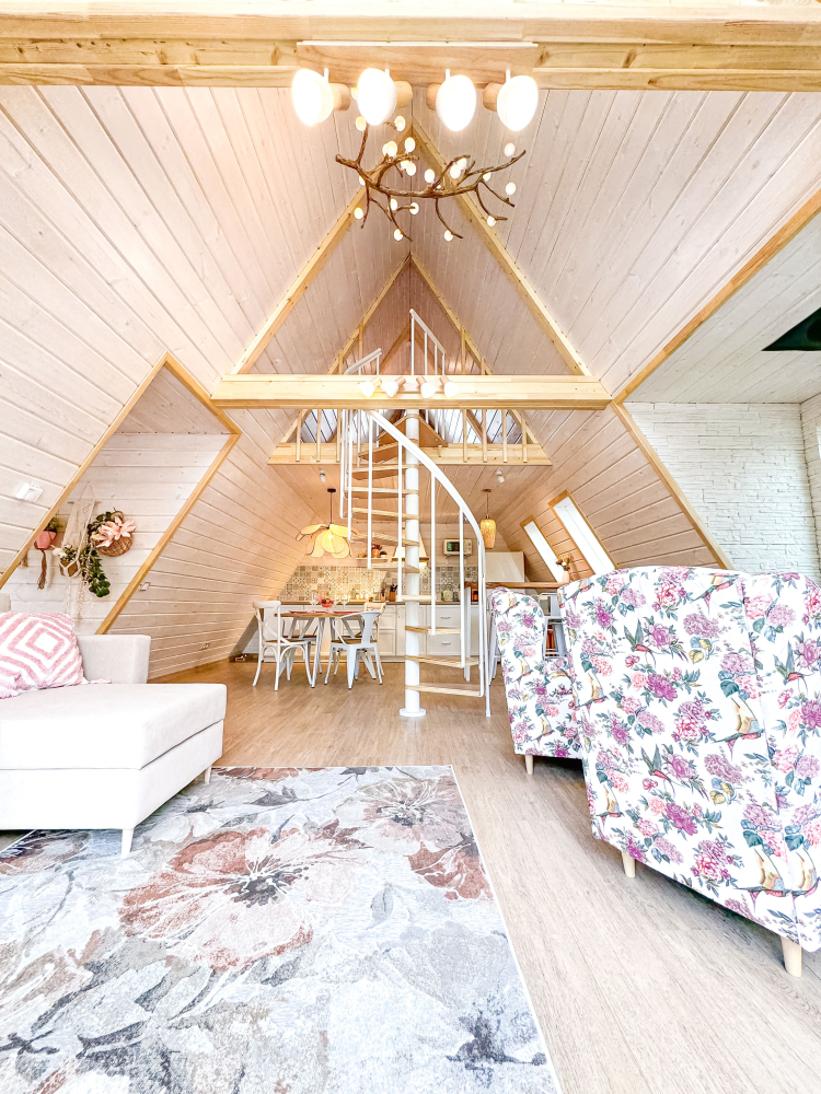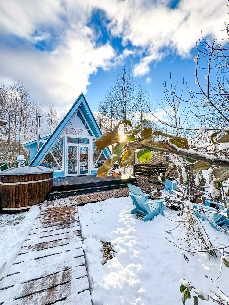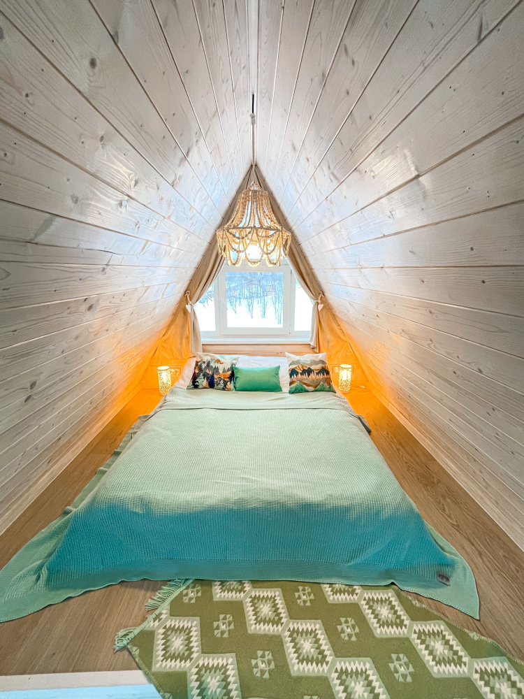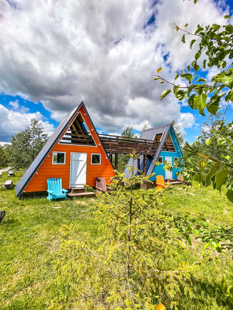 На нашей территории 13 уникальных цветных круглогодичных А-фрейм домов и этнодомов с горячими купелями на самом берегу реки. Каждый дом отличается цветовой гаммой не только снаружи, но и внутри.