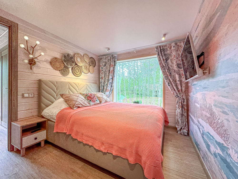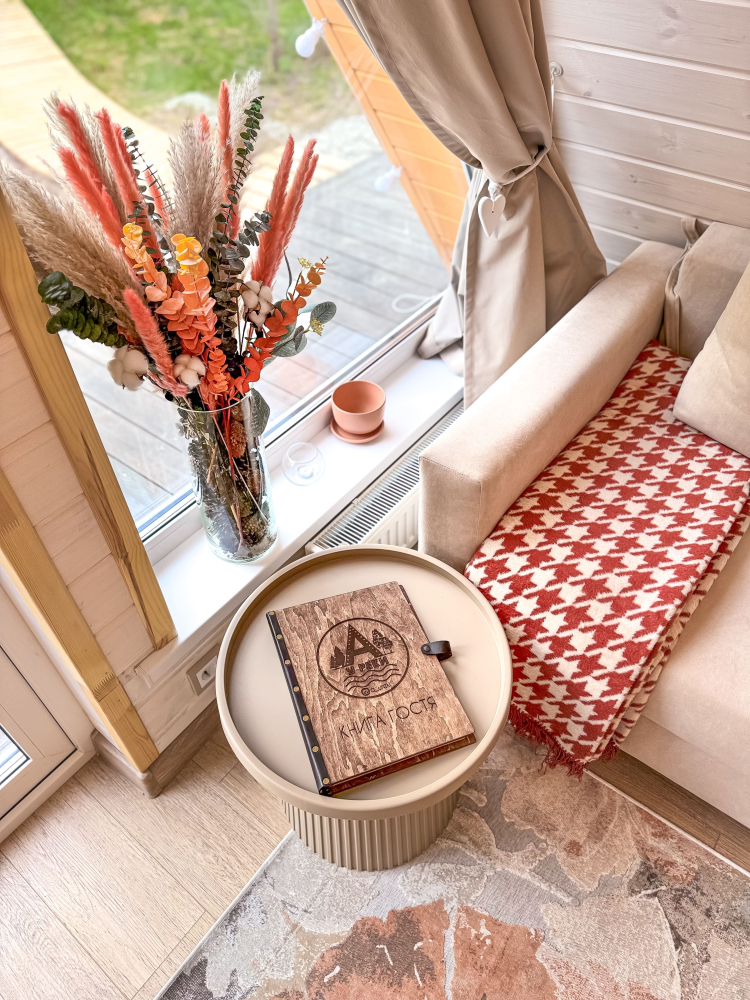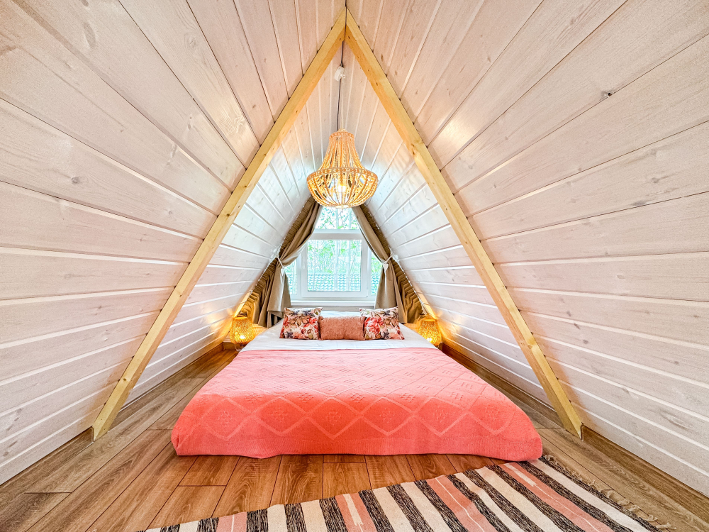 - Большой домик : Персиковый, рассчитан на 2–6 гостей.