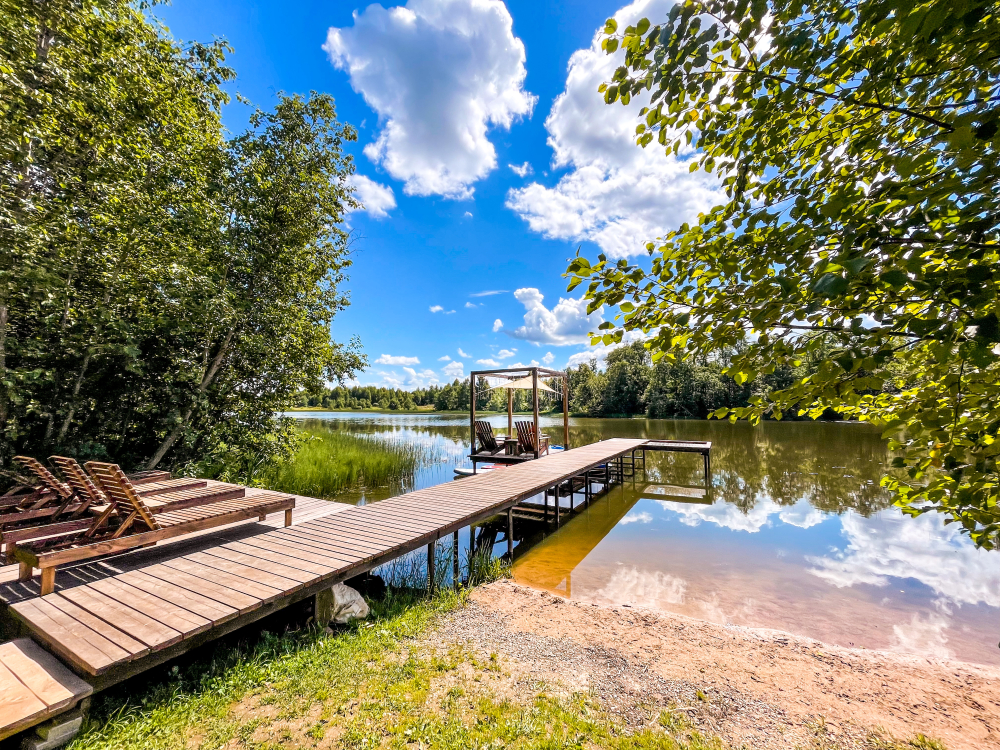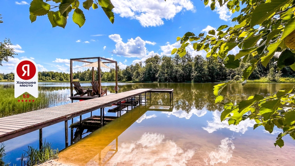 Мы находимся на берегу реки Шерстня. Летом приятная теплая водичка, есть пирс с бесплатными лодкой, сапбордами и каяками. Для детей на берегу есть песочек. На пирсе шезлонги, сетка для лежания над водой и зона с креслами. Для любителей рыбалки: в реке водится щука, окунь, плотва, карп, но имейте ввиду, что здесь нет коммерческой рыбалки с зарыбленным прудом, это естественная река с плотиной, поэтому берите прикормку, удочки и снасти и попытайте удачу!