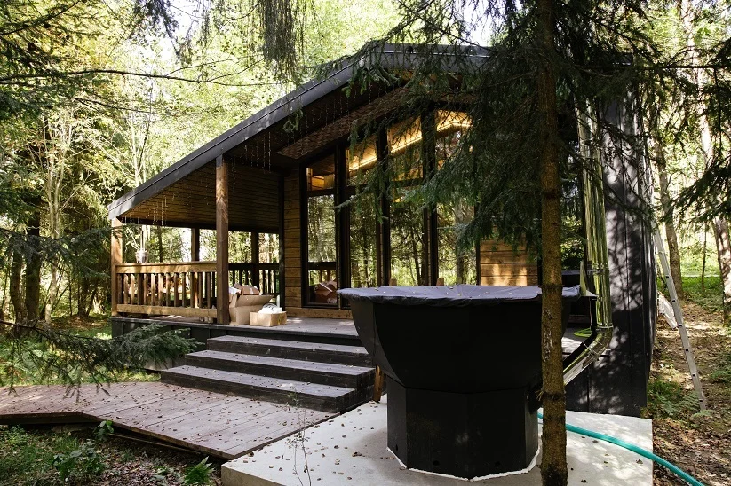- Уединение и комфорт: Дом окружен отдельной территорией, что обеспечивает конфиденциальность. В каждом доме есть дворик с индивидуальной зоной для отдыха, барбекю и сибирским чаном-куплю для отдыха на свежем воздухе.
