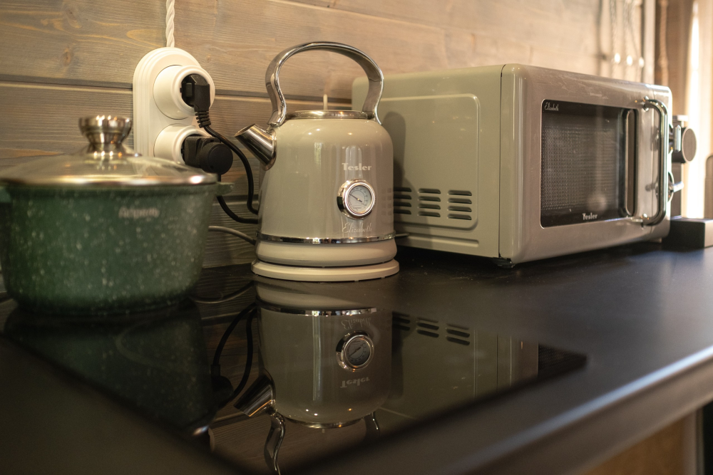 - Холодильник, варочная панель, микроволновка, посудомоечная машина, кофемашина, чайник.