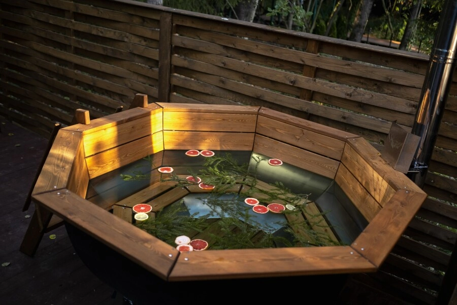В каждом домике есть чан Фурако, создающий атмосферу приватности, идеально подходящую как для отдыха с друзьями, так и для уединения с любимым человеком; горячая вода, ароматные травы и звездное небо над головой дополняют впечатления, стоимость растопки — 5 000 рублей.