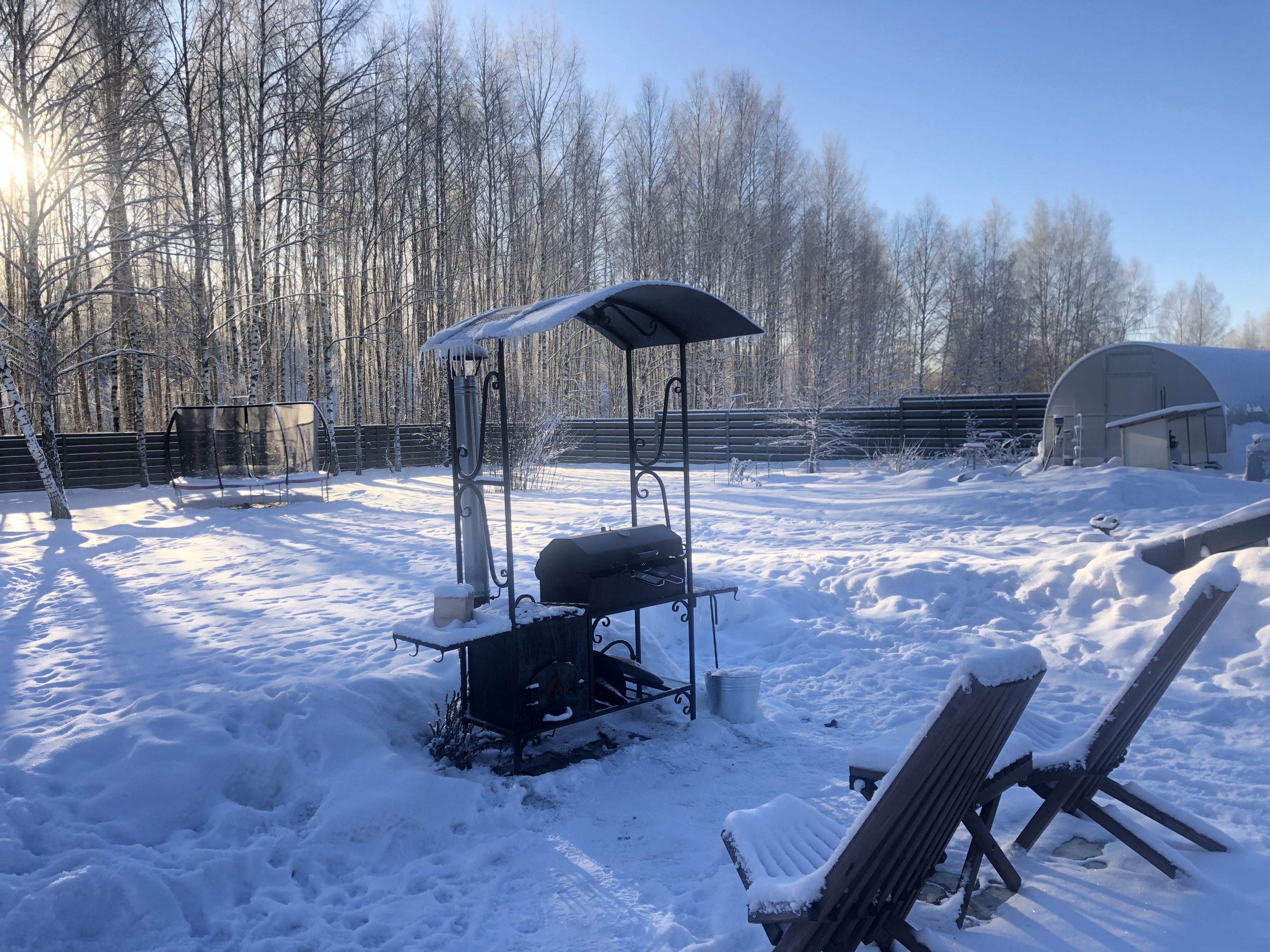 Решетка и шампуры входят в стоимость. Угли и розжиг необходимо привезти с собой. Также есть дровяная печь для казана и казан. Уличная мебель со столом