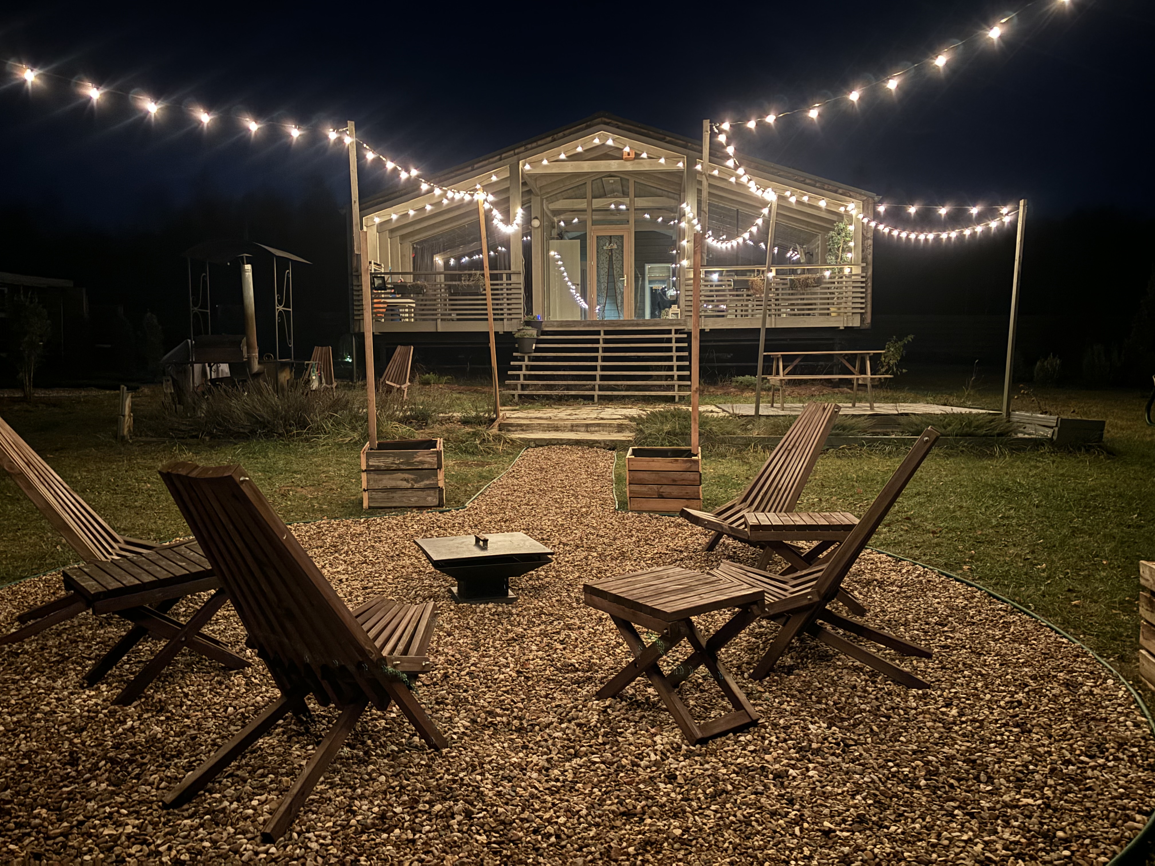 Костровая зона с чашей и креслами для атмосферных вечеров у огня.