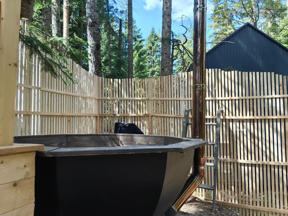 Горячий чан есть около домиков Соло 3 с террасой и банным чаном, Дом Соло 1 с видом на реку и банным чаном на террасе .