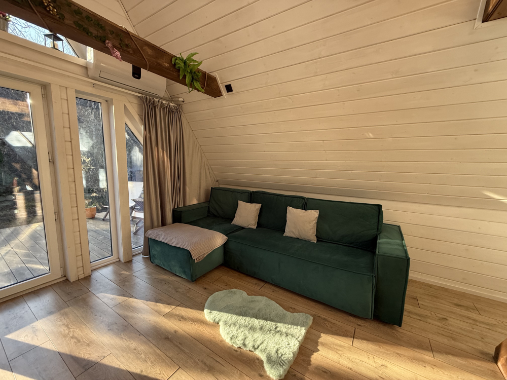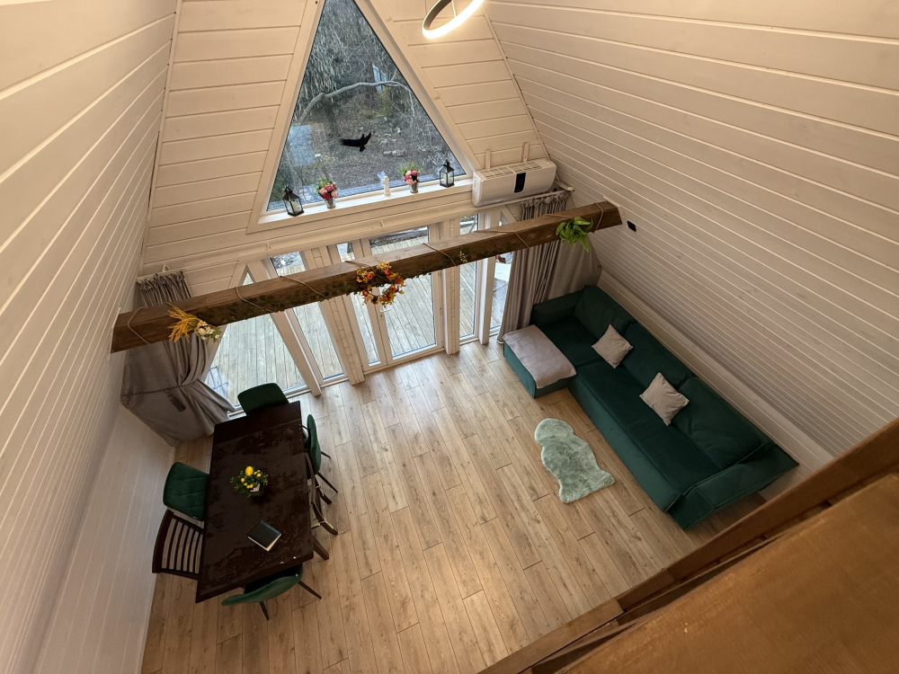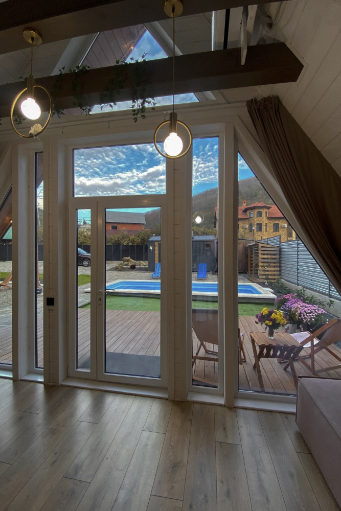 - Просторная гостиная с террасой и видом на лес