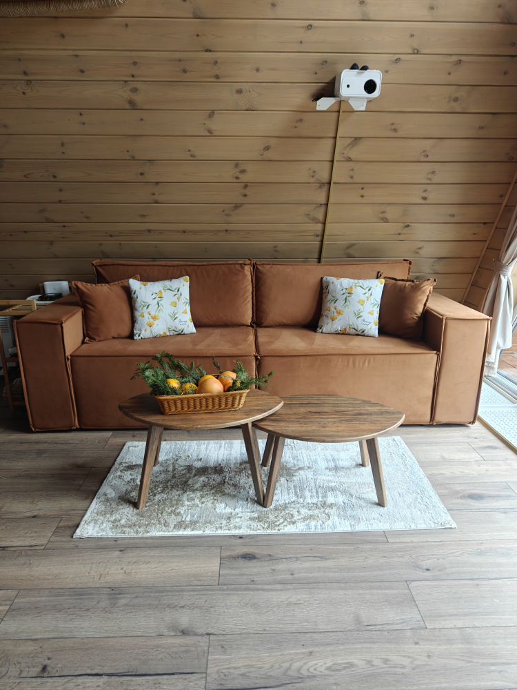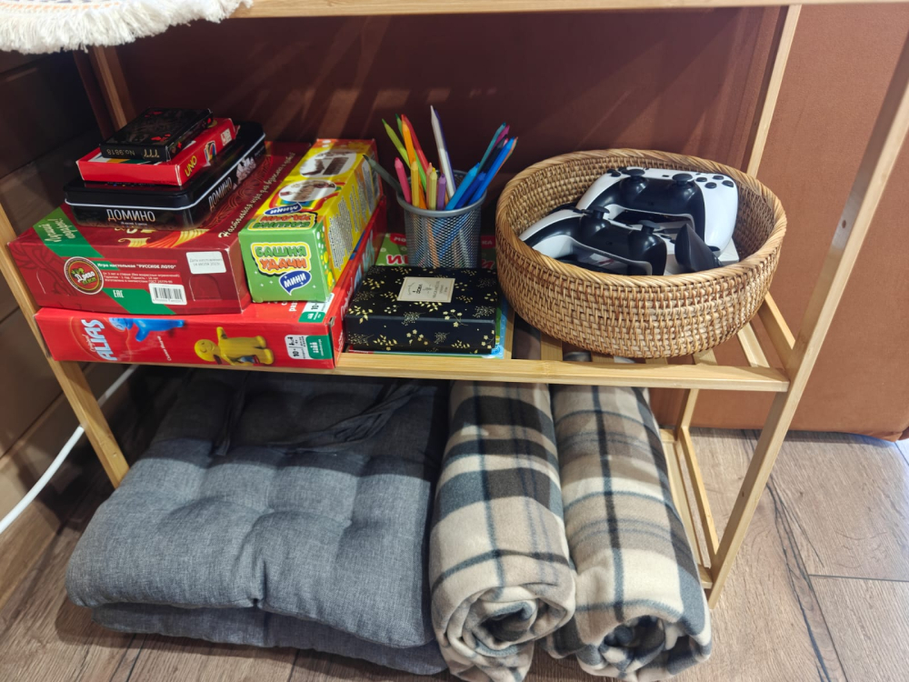 Гостиная с панорамными окнами:обеденная группа, раскладной двухспальный диван,проектор, кондиционер,настольные игры,детские игрушки,аромо-лампа, музыкальная колонка, Wi-Fi.