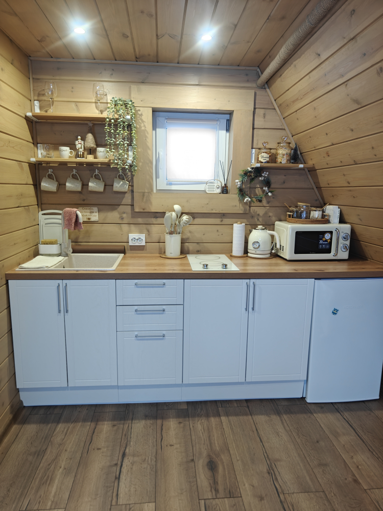 Кухня: раковина,плита,микроволновка,холодильник,чайник, посуда для приготовления пищи и сервировки,чай,кофе,сахар,масло,приправы,бумажные полотенца)