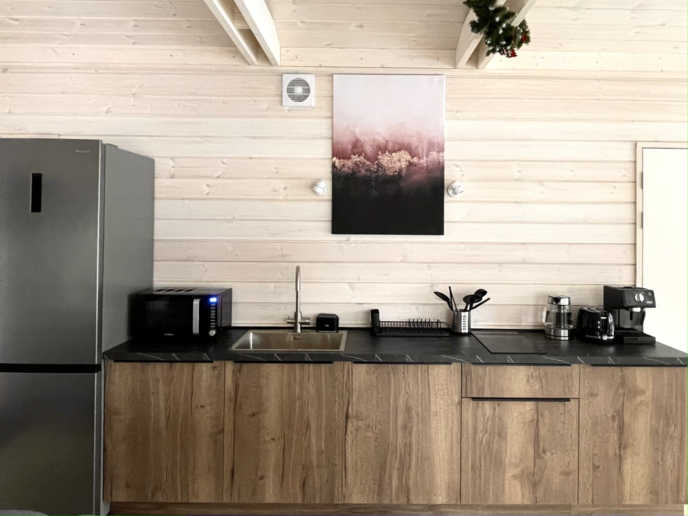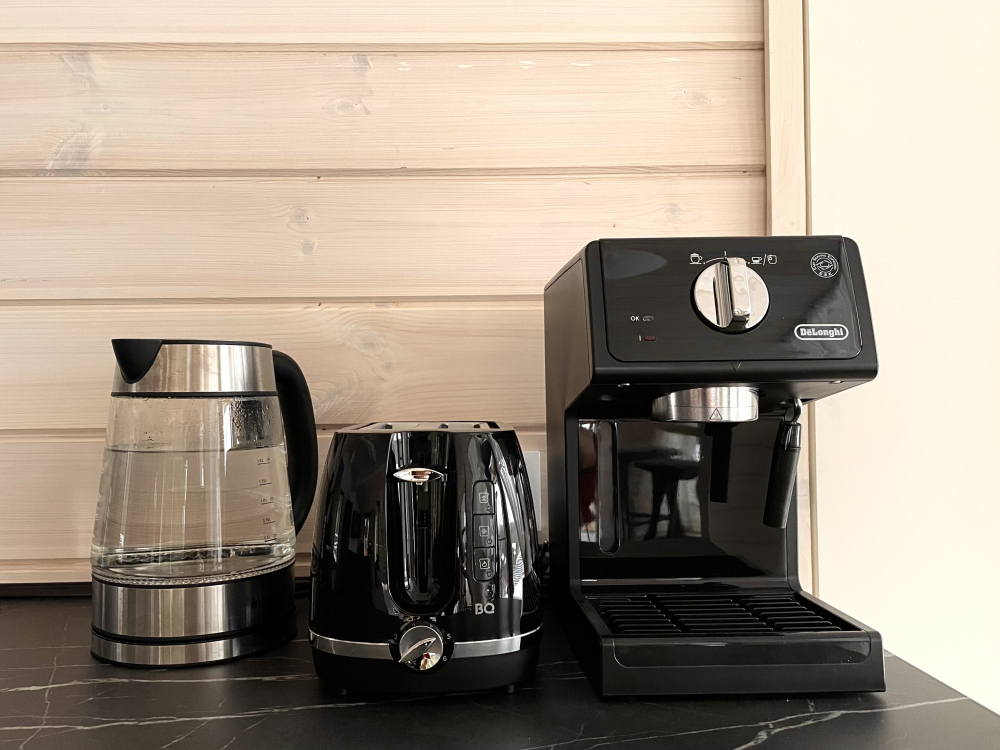 Полностью оборудованная кухня: варочная панель, большой холодильник, кофемашина, кофемолка, посудомоечная машина, чайник, тостер.