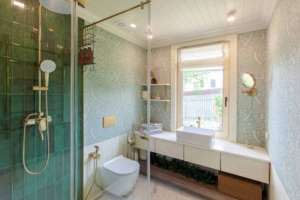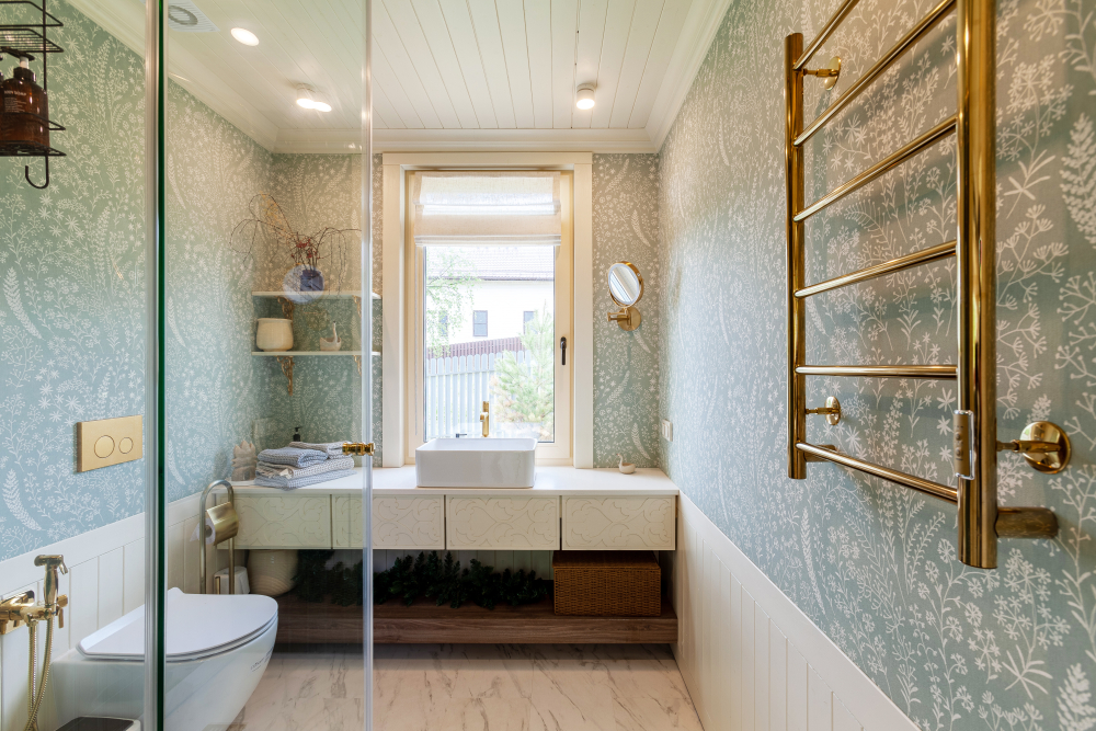 Ванная комната с туалетом, душевой кабиной и теплым полом.
