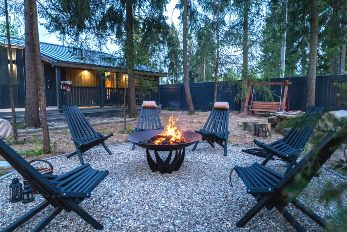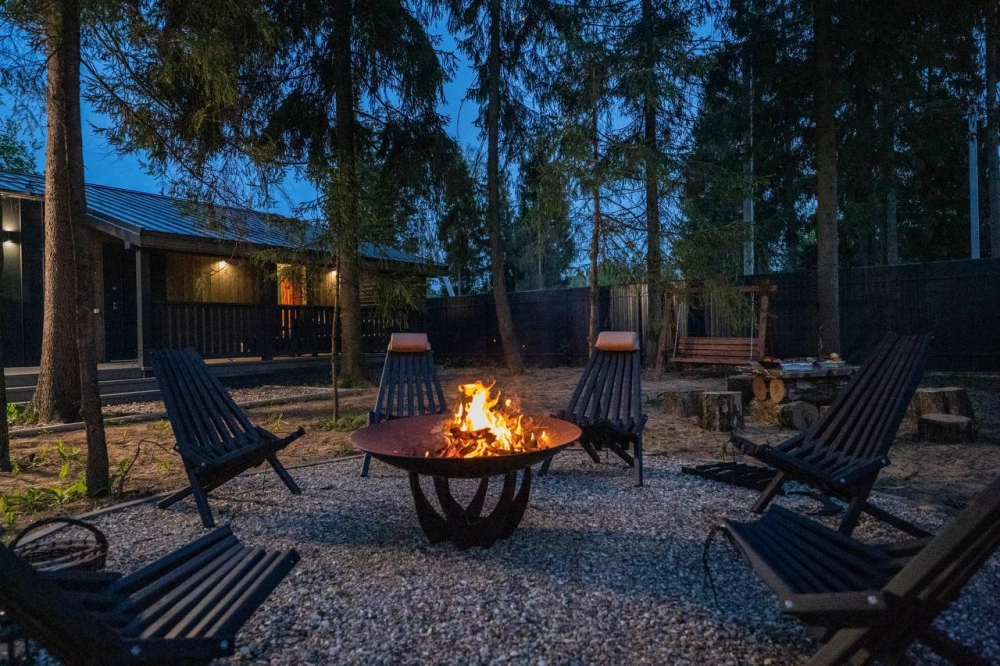 На территории комплекса есть уютная костровая зона, где можно насладиться теплом огня и приятной атмосферой, идеально подходящей для вечерних посиделок с семьёй или друзьями; для удобства гостей необходимо привезти дрова, уголь и средства для розжига, всё остальное мы предоставляем.