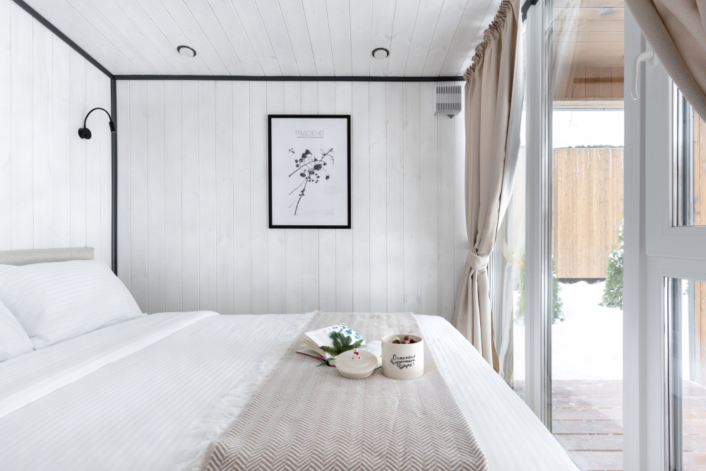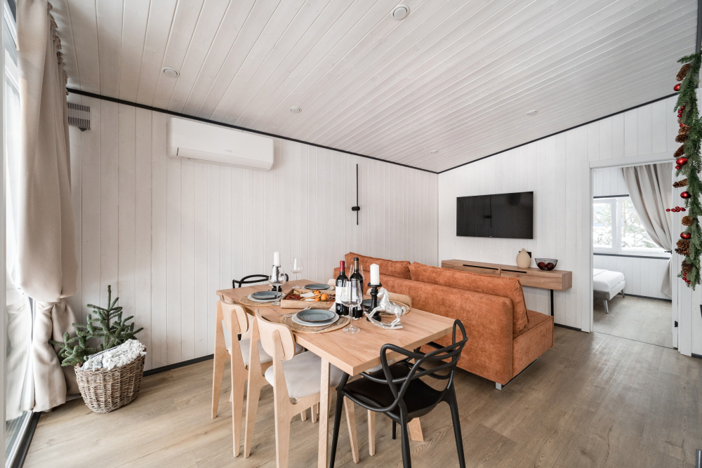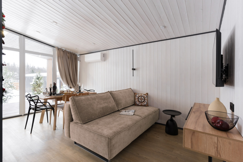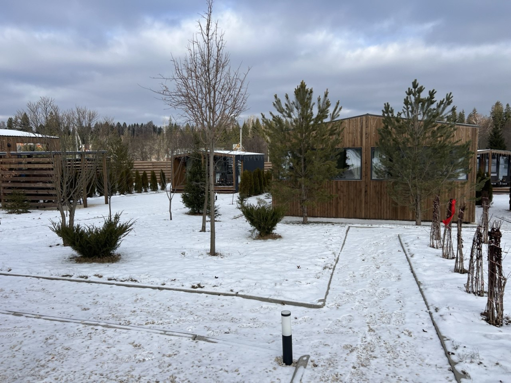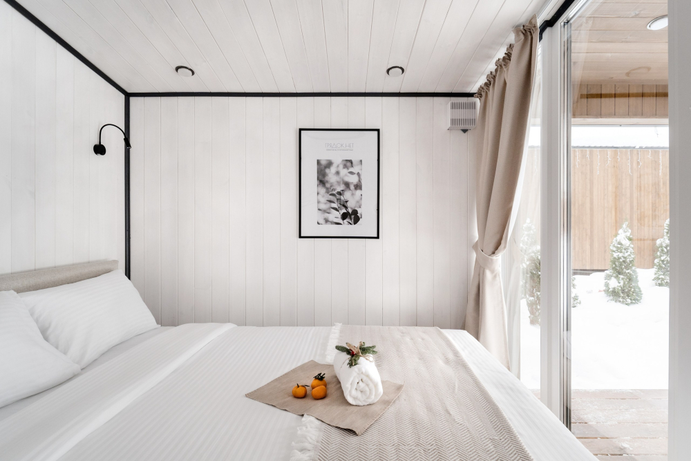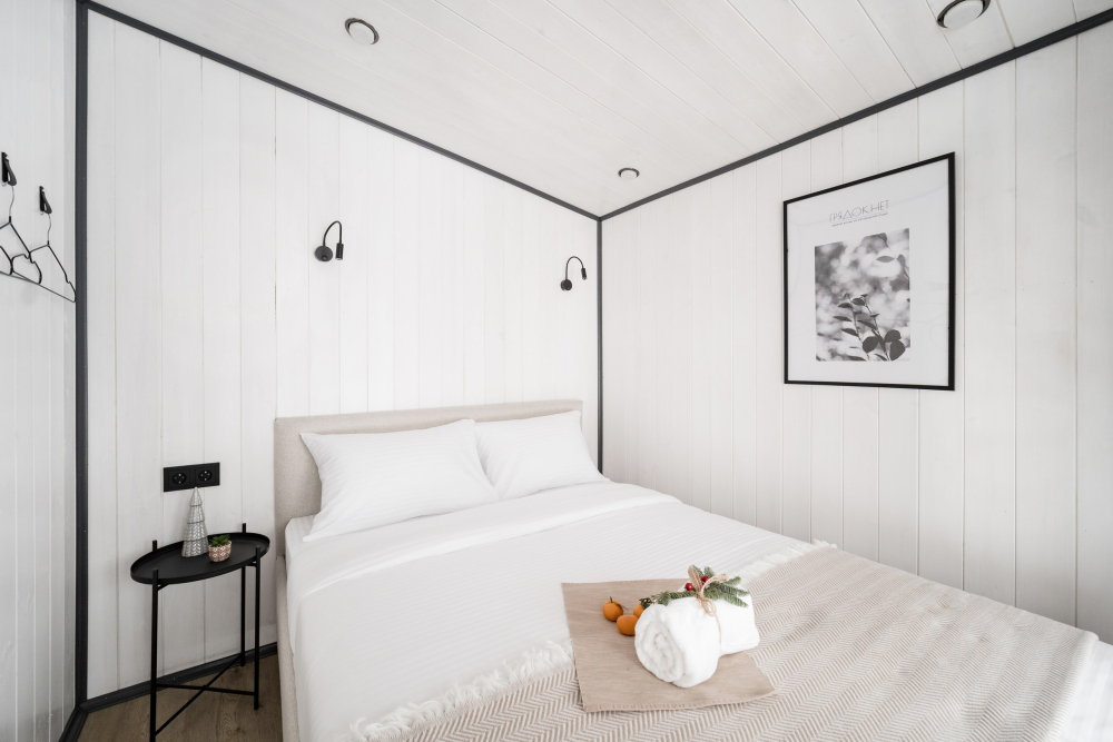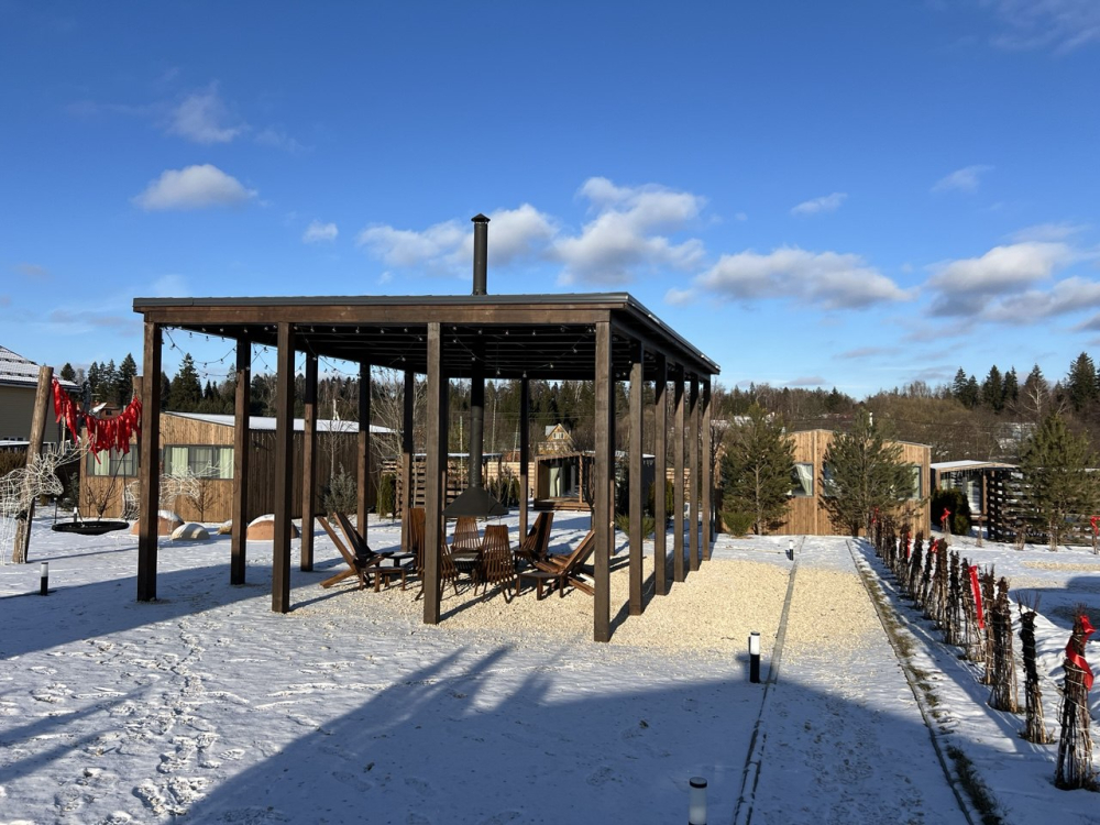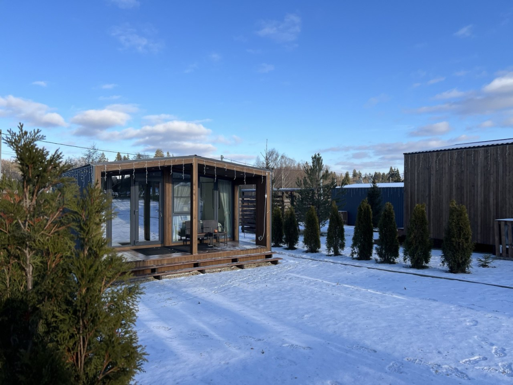 На закрытой охраняемой территории расположены 8 современных домиков, каждый из которых вмещает до 6 гостей. Пространство оформлено с вниманием к деталям — всё продумано для отдыха и расслабления.