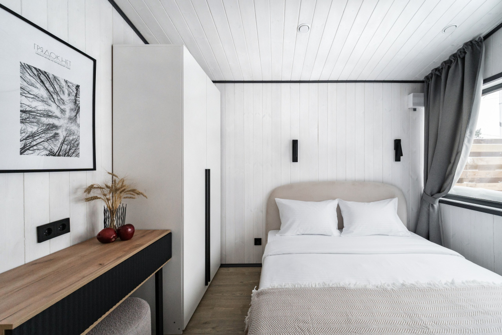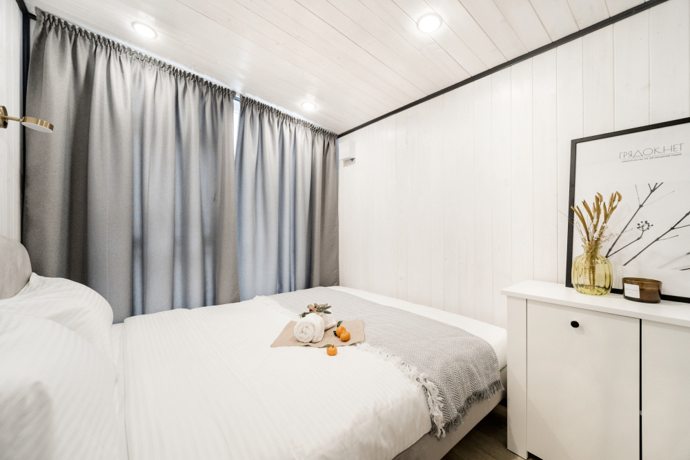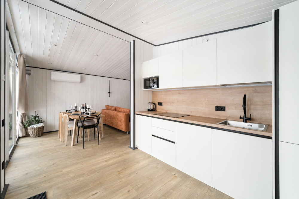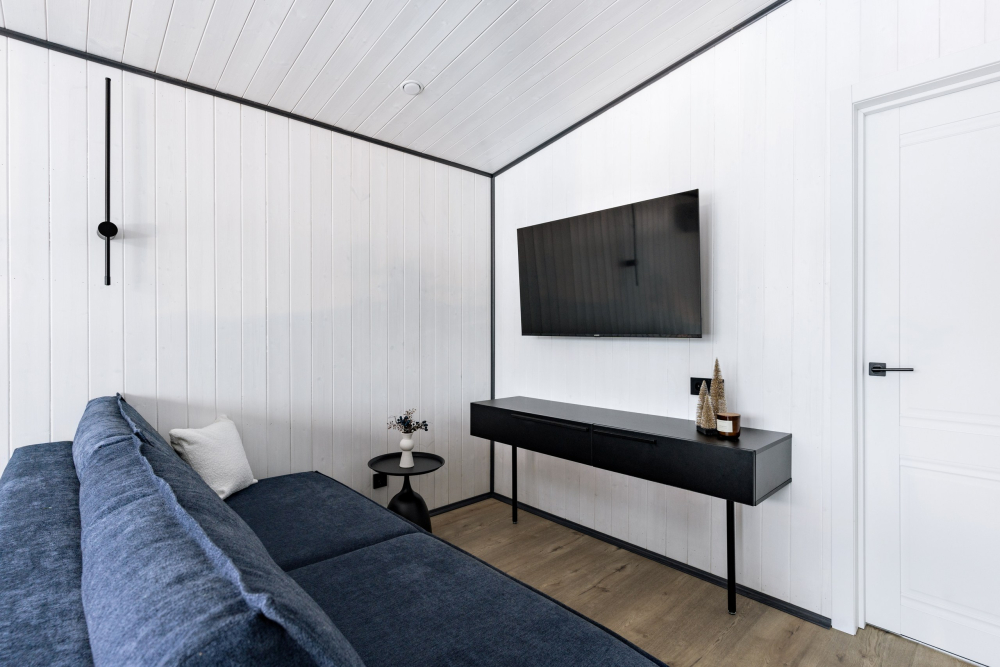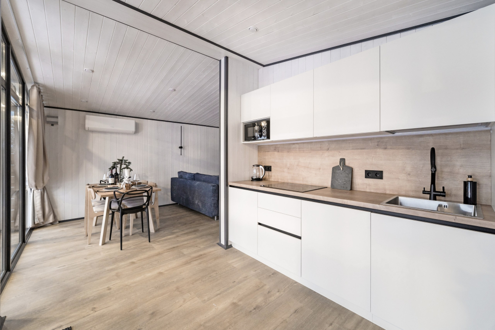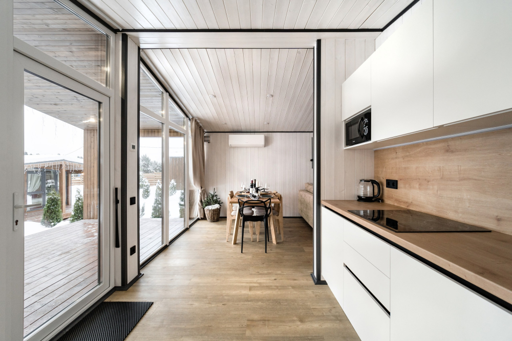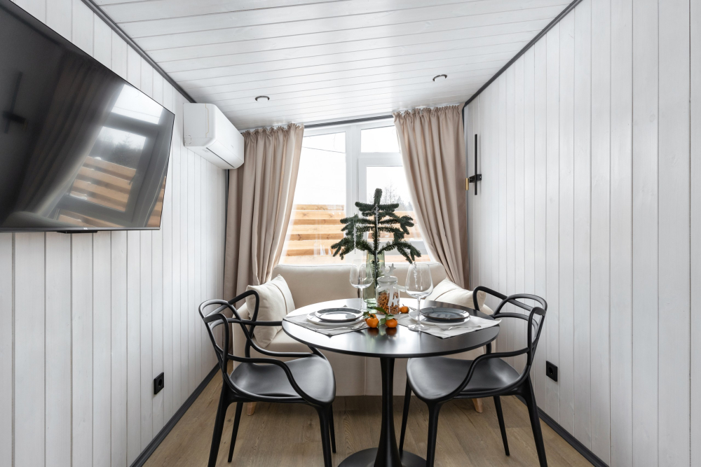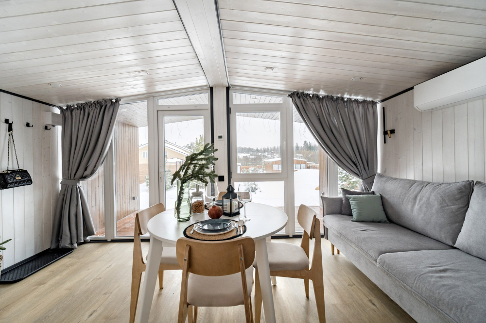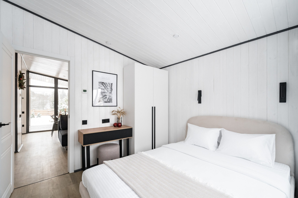 На закрытой охраняемой территории расположены 8 современных домиков, каждый из которых вмещает до 6 гостей. Пространство оформлено с вниманием к деталям — всё продумано для отдыха и расслабления.