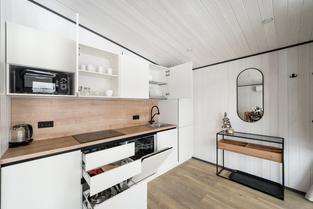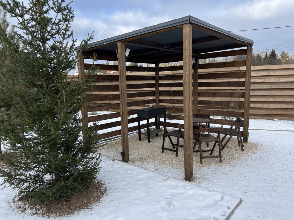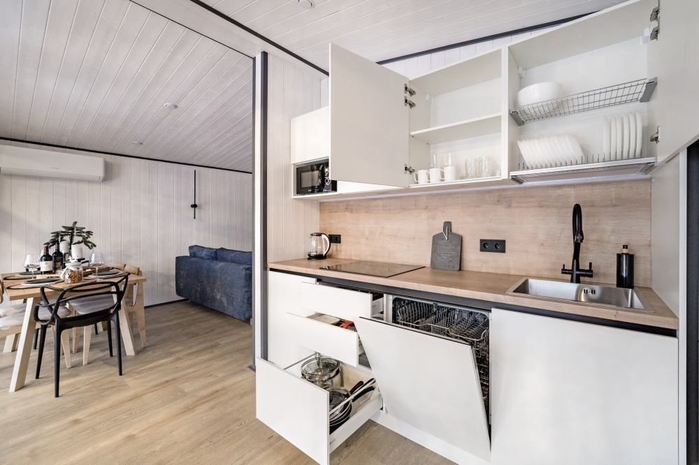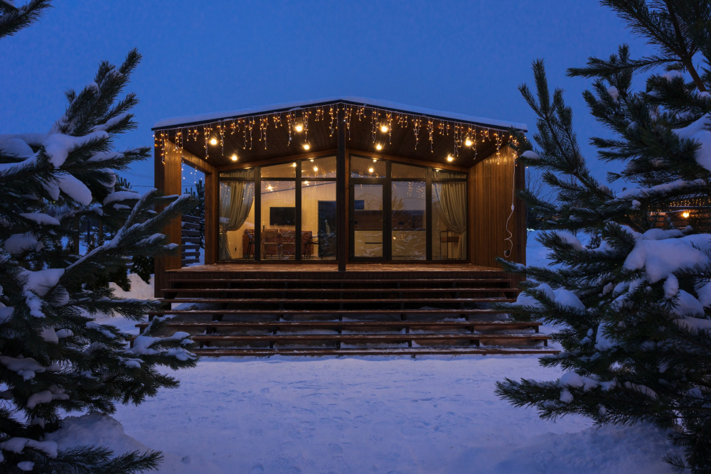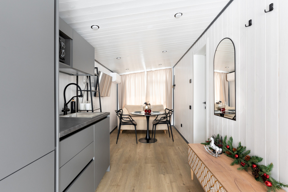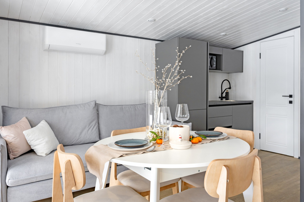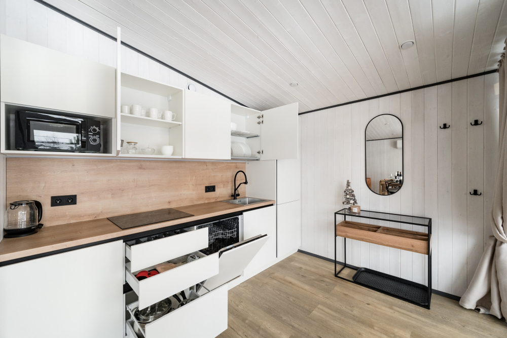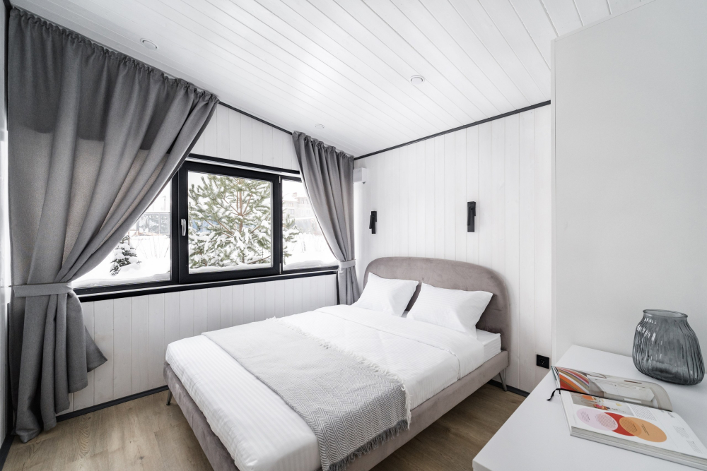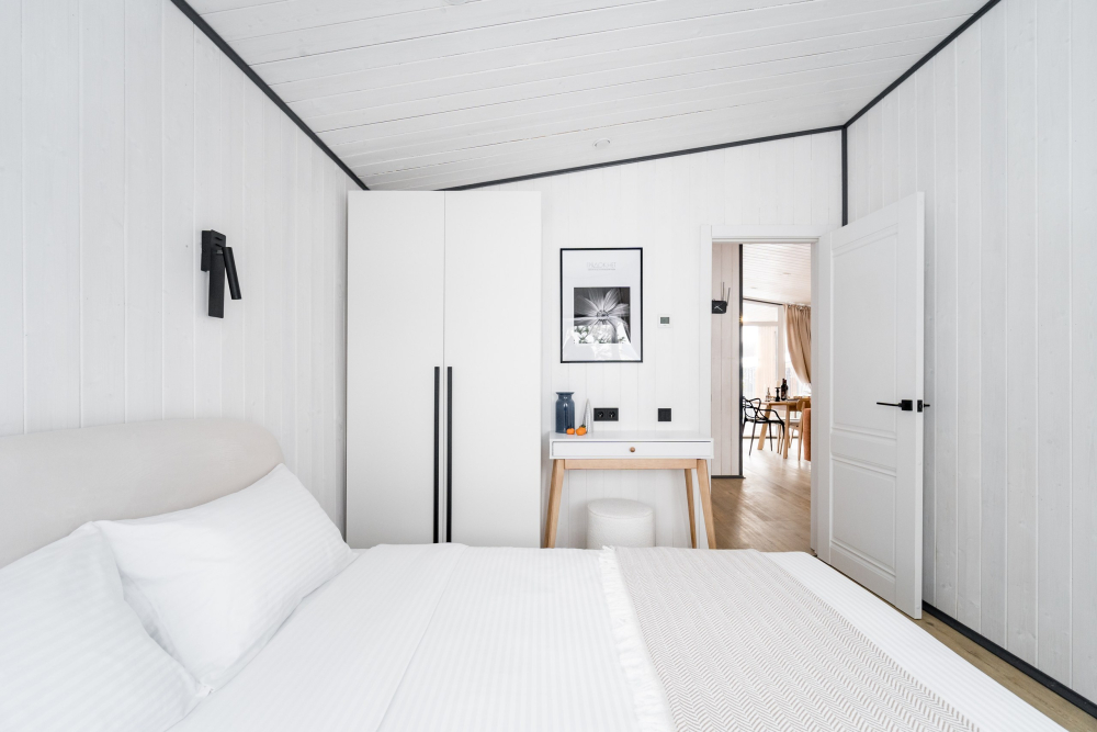 На закрытой охраняемой территории расположены 8 современных домиков, каждый из которых вмещает до 6 гостей. Пространство оформлено с вниманием к деталям — всё продумано для отдыха и расслабления.