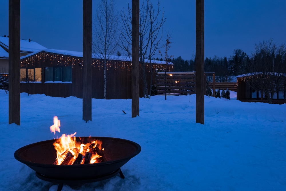 Центральная костровая чаша с перголой — уютное место для общения и музыки под звёздами