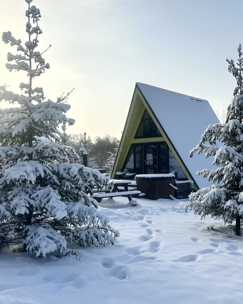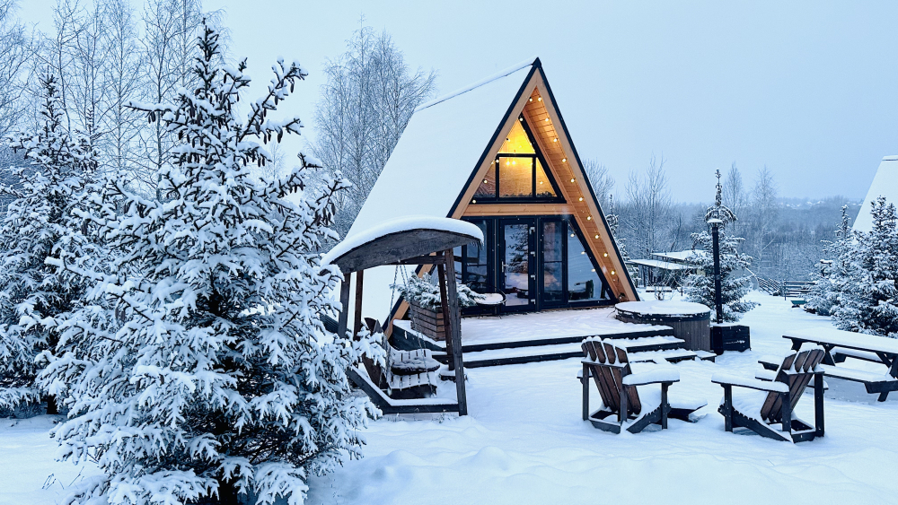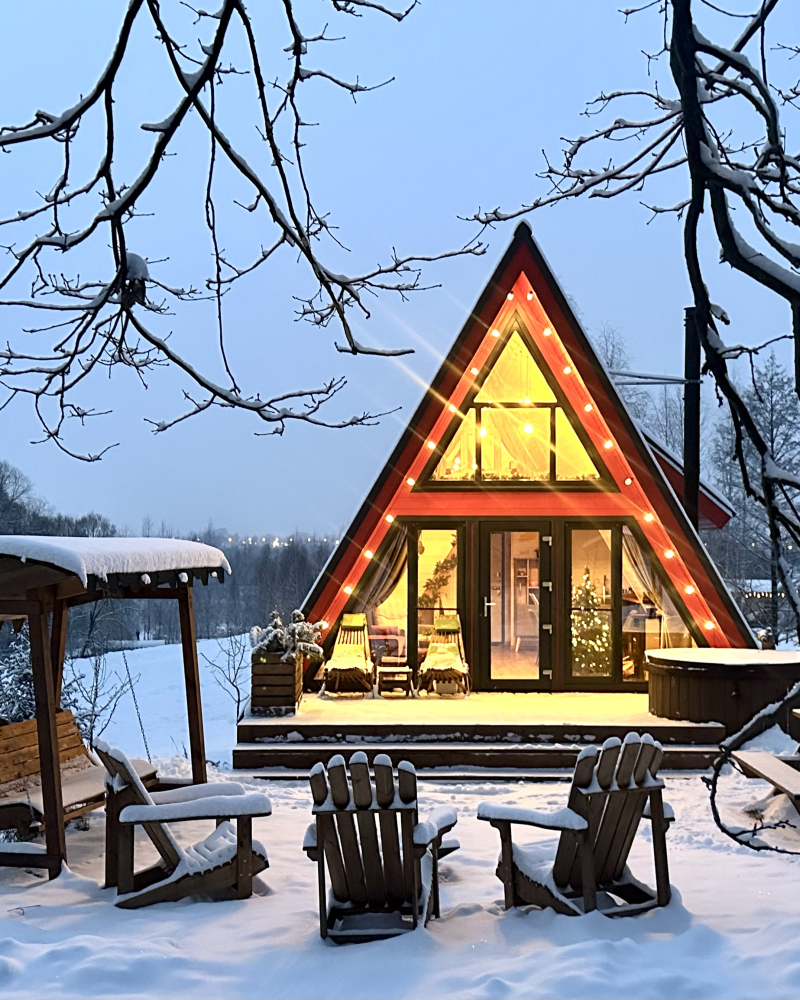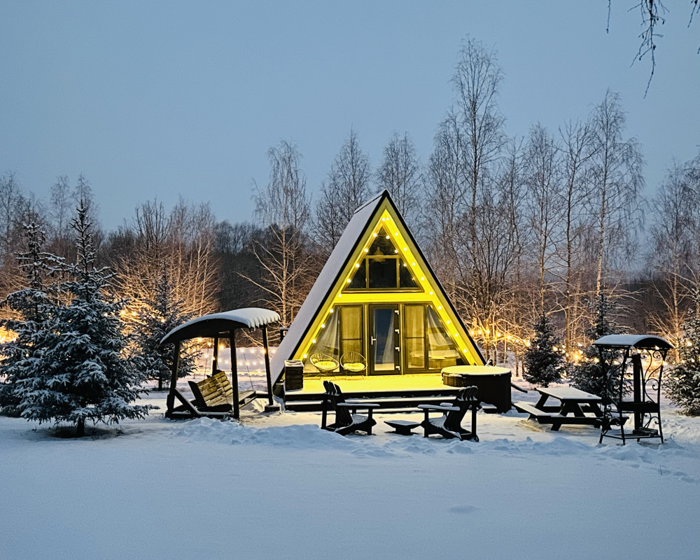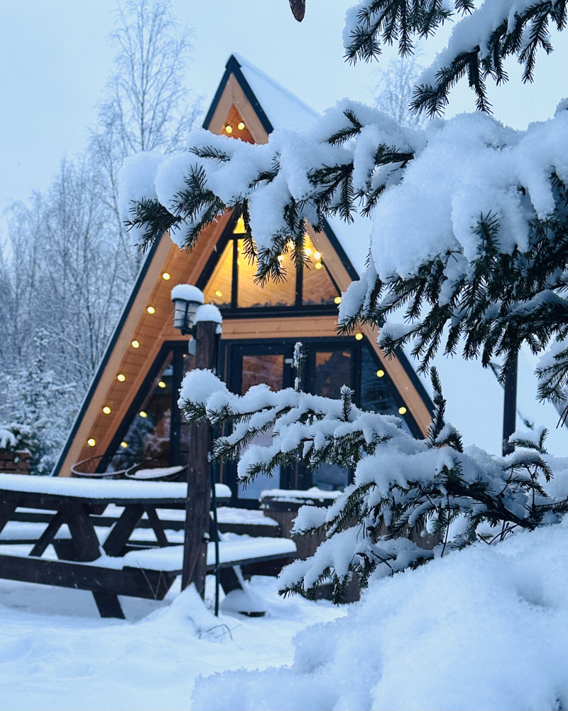 На территории 6 уютных A-фрейм домиков для круглогодичного проживания: