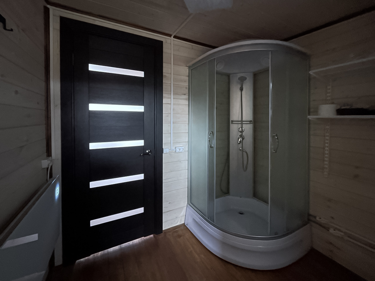 Одноэтажный коттедж с двумя спальнями (кровать и раскладной диван), гостиной с камином, баней на дровах и санузлом с душевой кабиной.