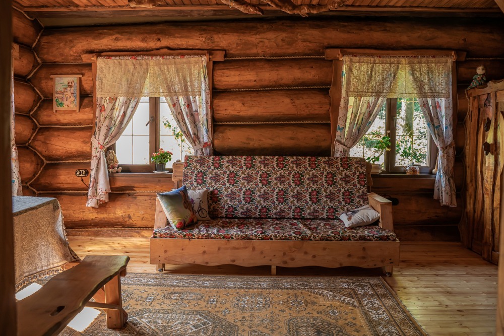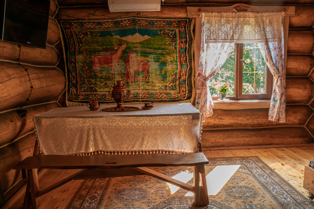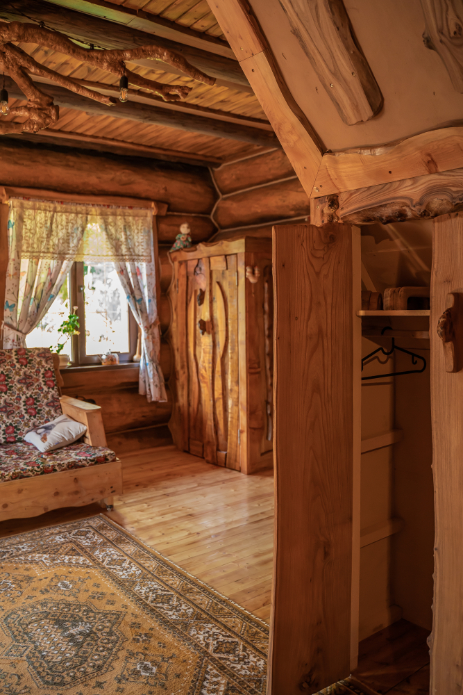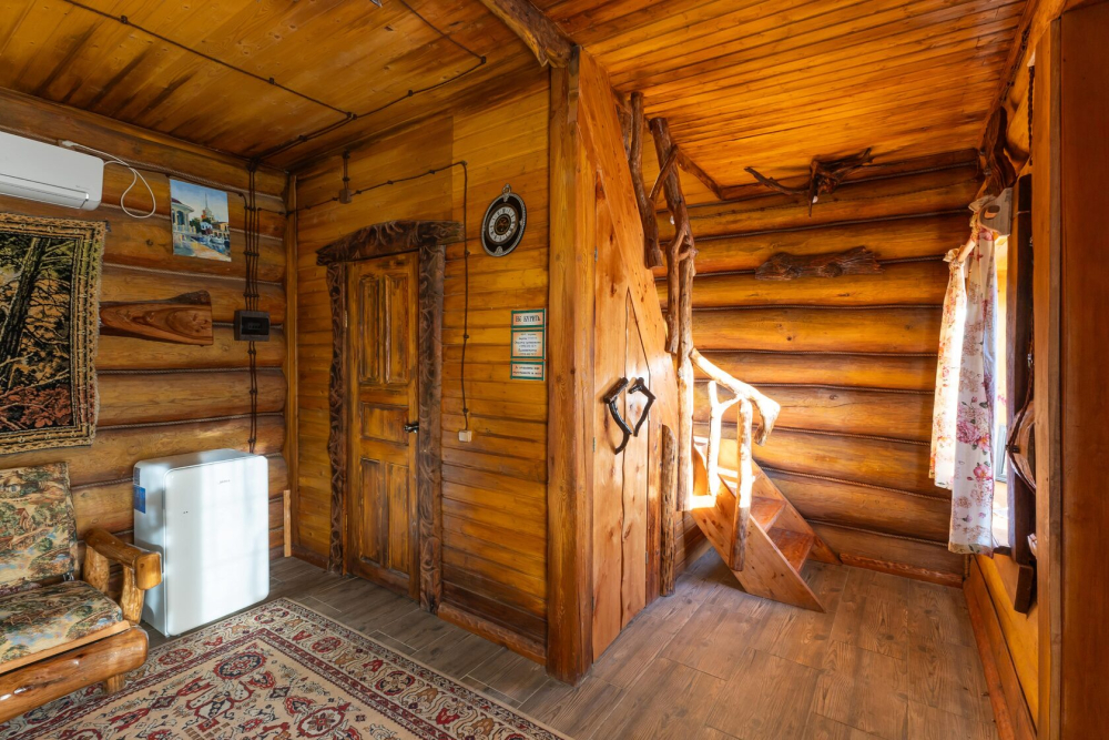Дом имеет свой самобытный интерьер: деревянные столы, стулья и скамьи, светильники – и все это выполненная вручную мебель из разных пород дерева.2 часа аренды 10 000 рублей
