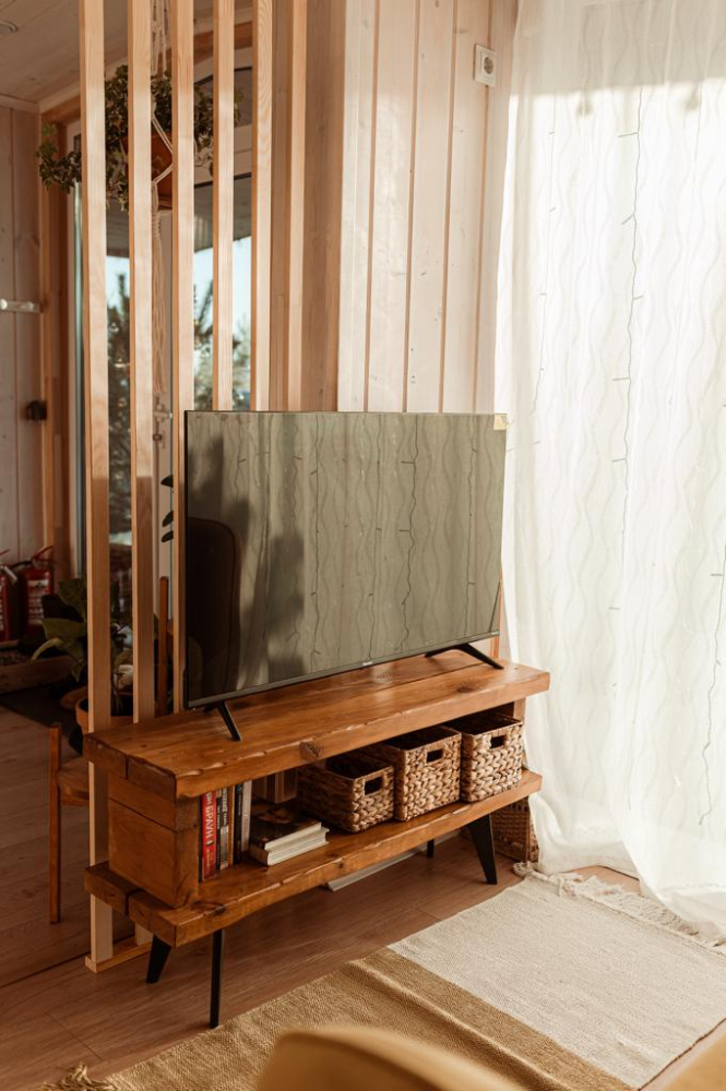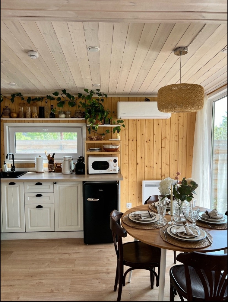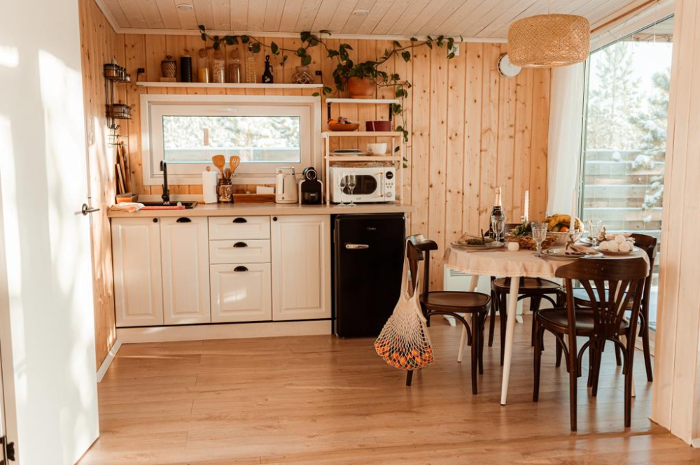 - Кухня-гостиная: Просторная зона с индукционной плитой, микроволновой печью, чайником, холодильником, капсульной кофемашиной и всей необходимой посудой. В гостиной — диван, телевизор, проектор, колонка "Алиса" и настольные игры