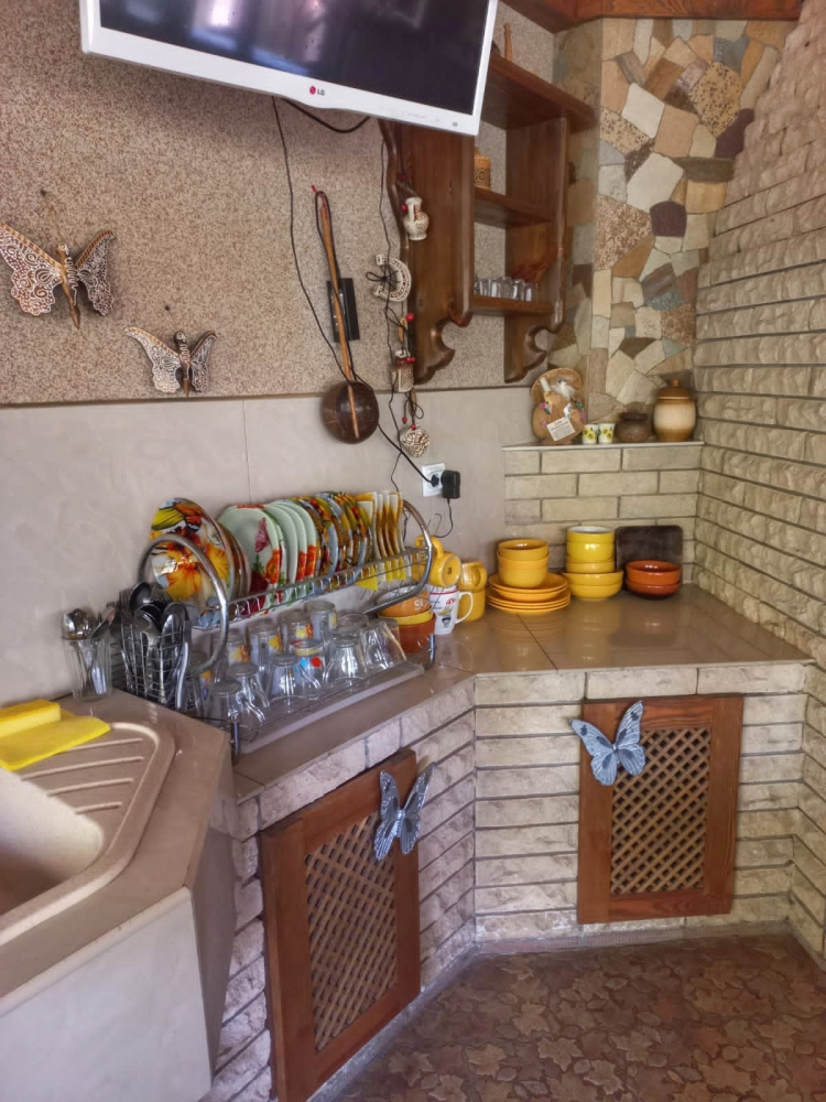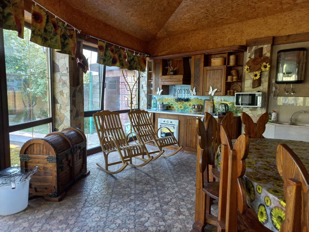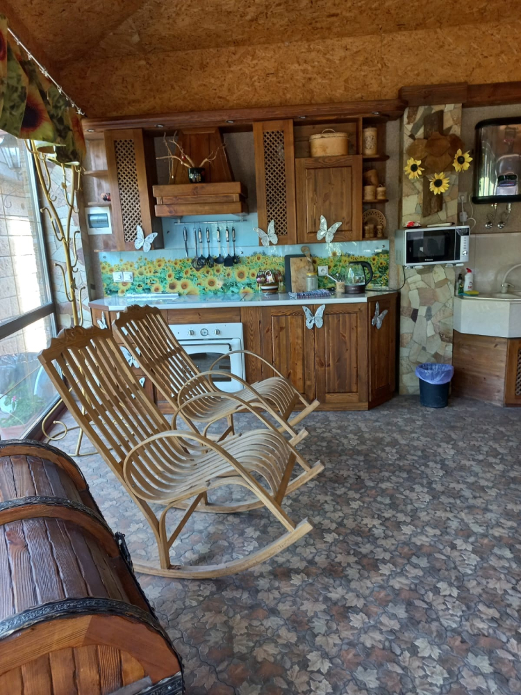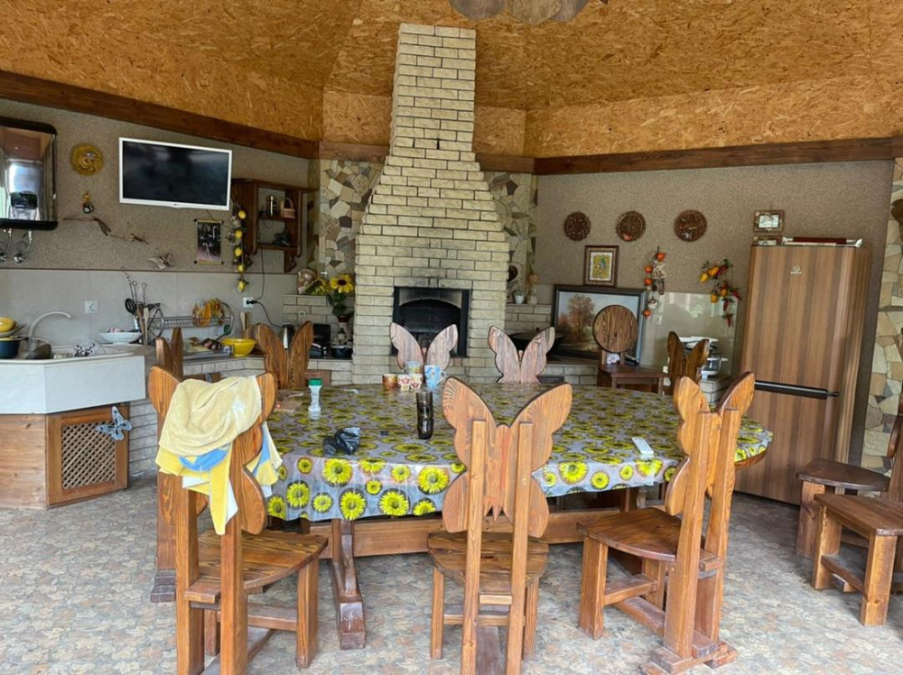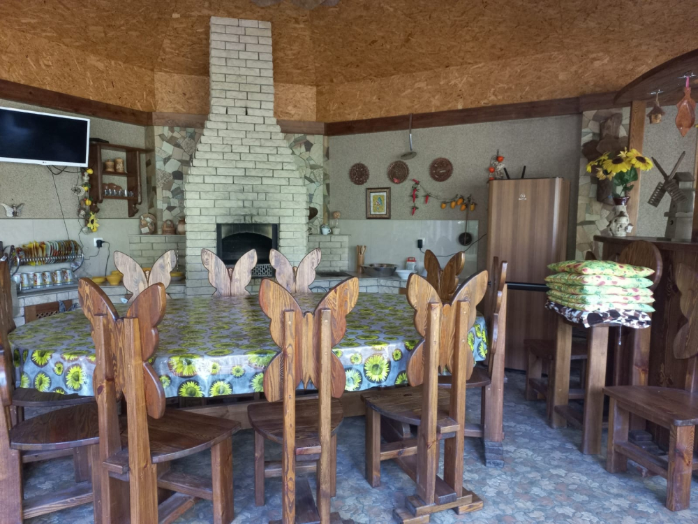 - Кухня: печь, плита, духовка, столы, посуда, место для готовки на казане или мангале;