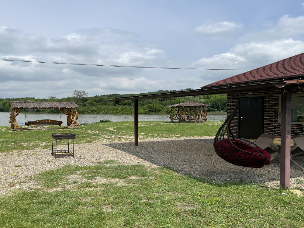 - Беседка с мангальной зоной: стол на 12 человек, скамейки, свет, вода, вид на озеро, возле домика СПА
