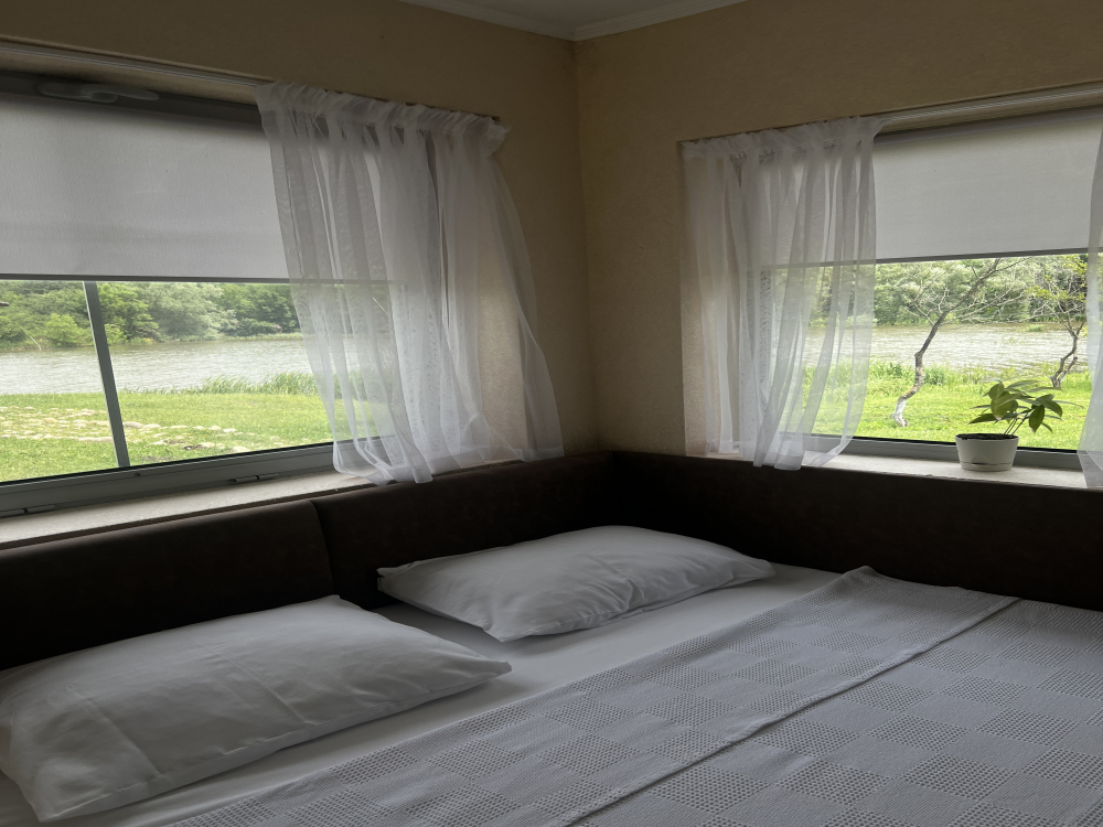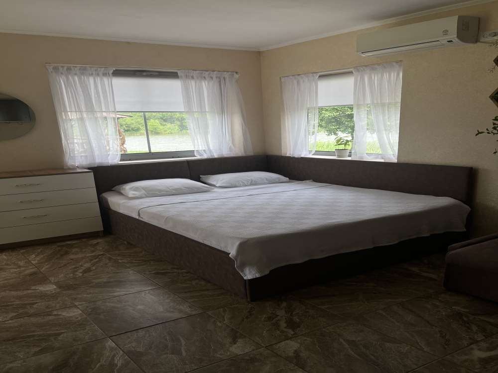 - Спальня и гостиная: комфортные кровати, панорамные окна с видом на озеро.