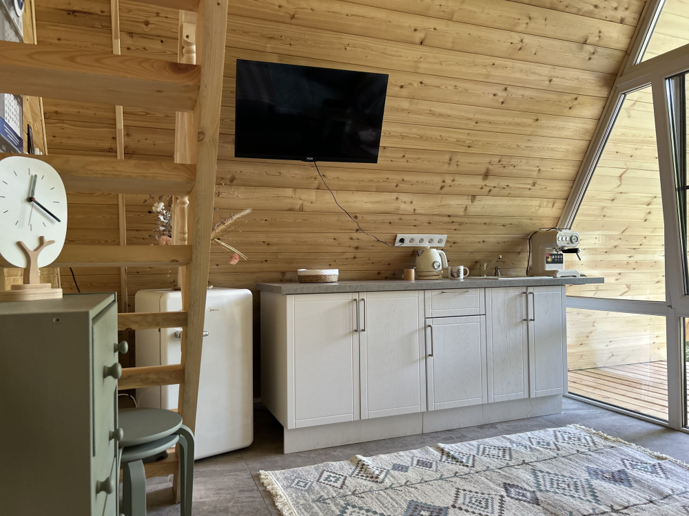 - Мини-кухня : холодильник, электрочайник, кофемашина, микроволновка, индукционная плита, посуда.