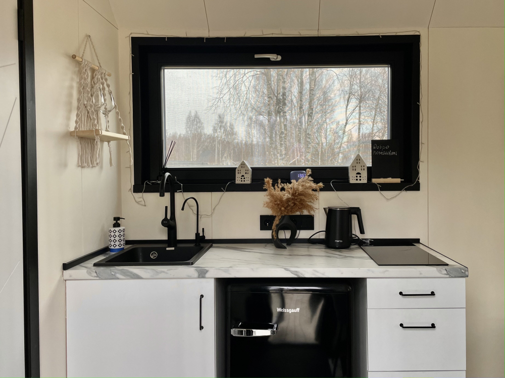 - Небольшая кухня со столом, стульями, варочной панелью, холодильником, кофеваркой, чайником и набором посуды. Для удобства всегда есть кофе в зернах и кофемолка, чай, сахар, соль и растительное масло.