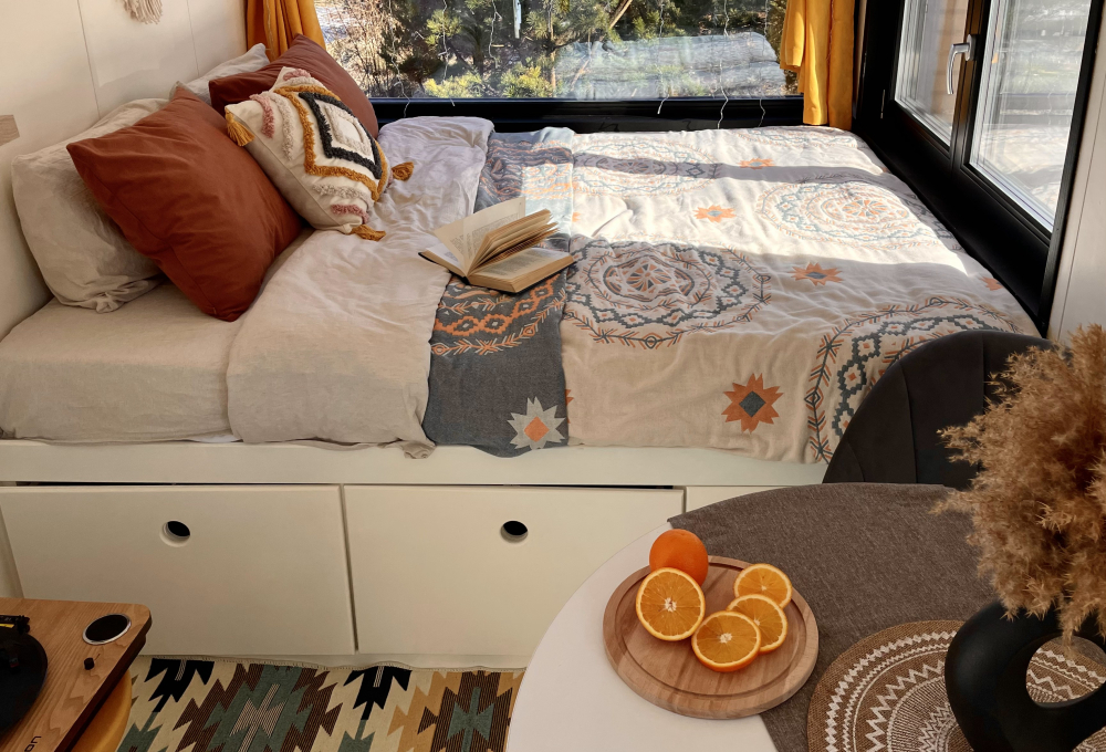 Удобно размещается до 2 человек, у вас будет двуспальная кровать на подиуме.